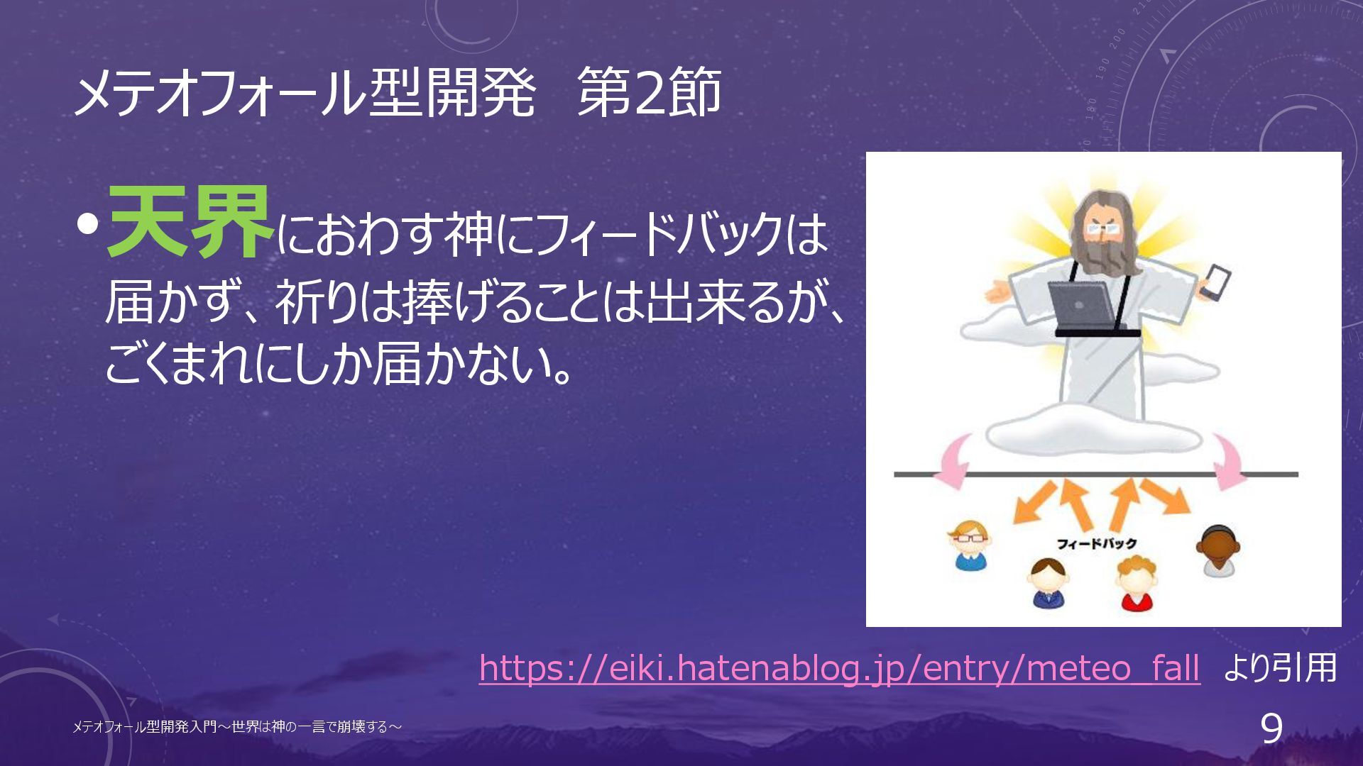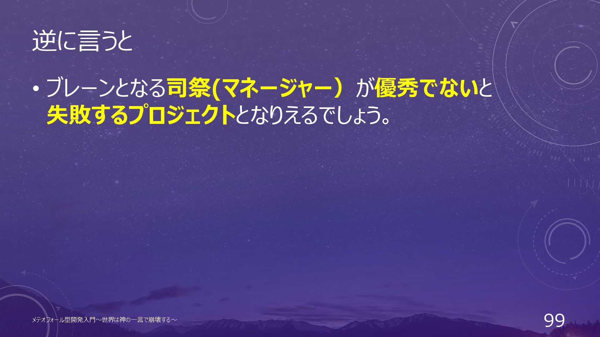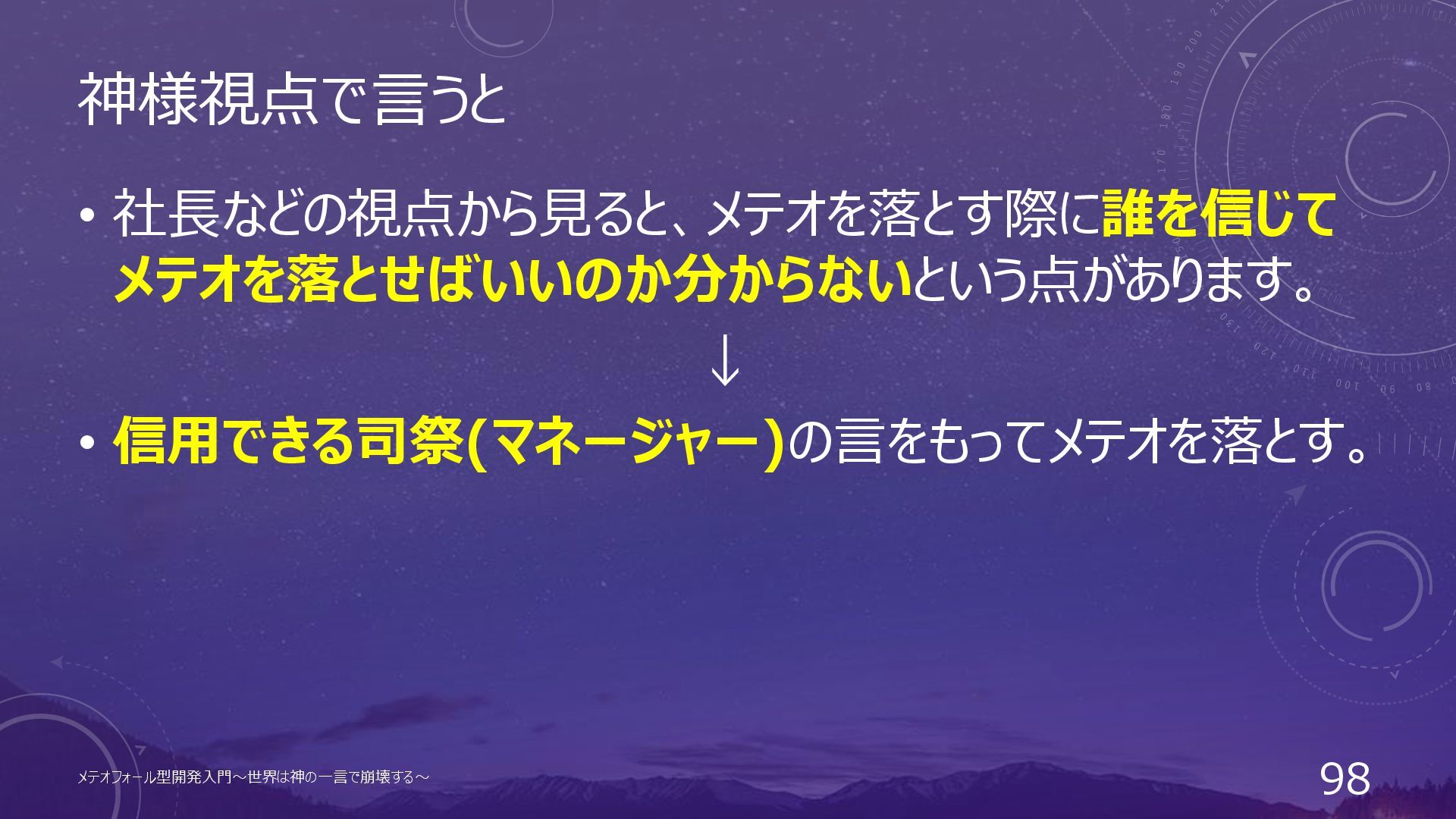 神様視点で言うと • 社長などの視点から見ると、メテオを落とす際に誰を信じて メテオを落とせばいいのか分からないという点があります。 ↓ • 信用できる司祭(マネージャー)の言をもってメテオを落とす。 メテオフォール型開発入門~世界は神の一言で崩壊する~ 98