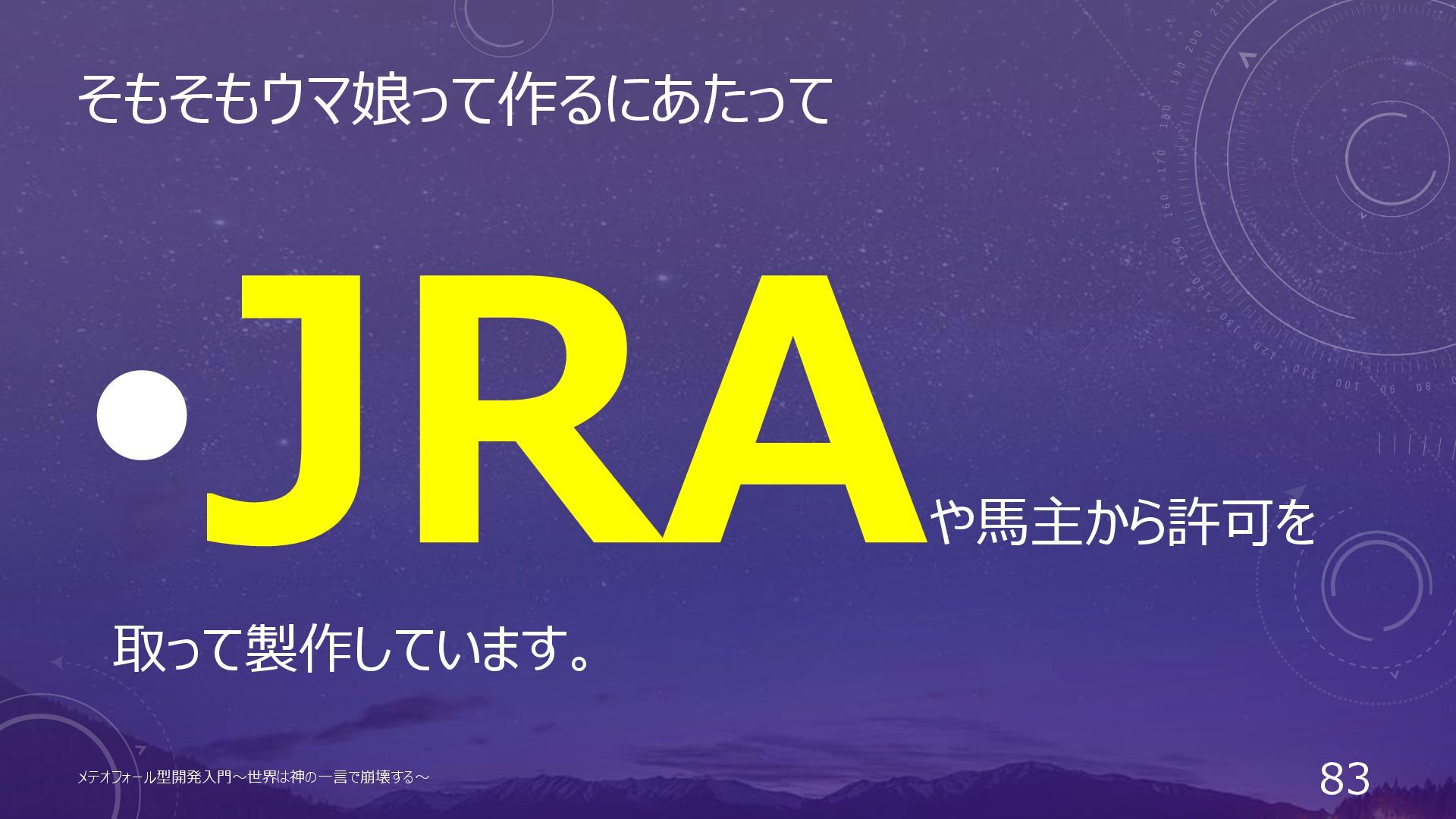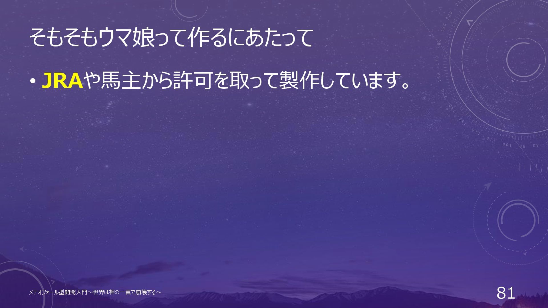 そもそもウマ娘って作るにあたって • JRAや馬主から許可を取って製作しています。 メテオフォール型開発入門~世界は神の一言で崩壊する~ 81