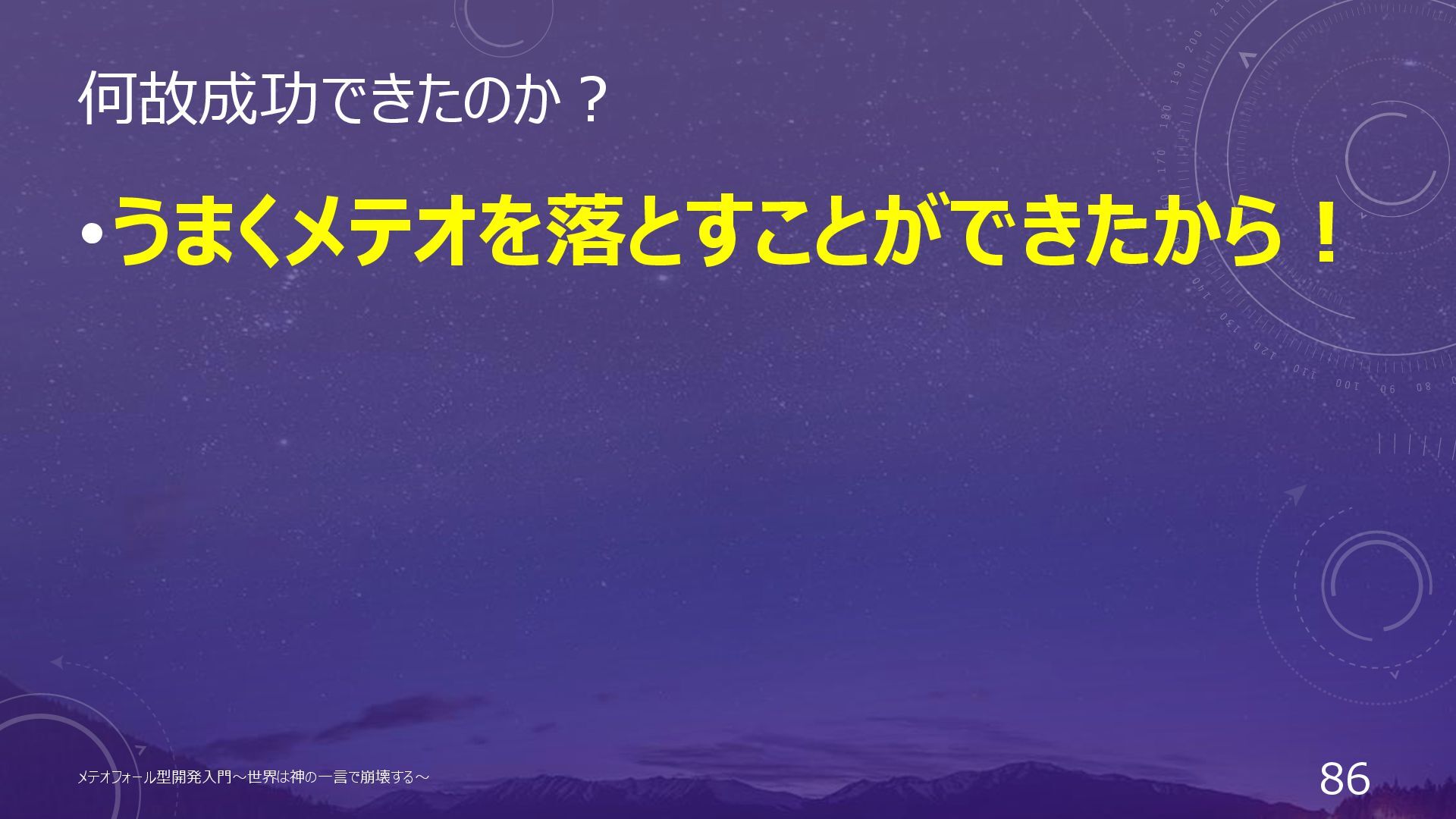 何故成功できたのか? •うまくメテオを落とすことができたから! メテオフォール型開発入門~世界は神の一言で崩壊する~ 86