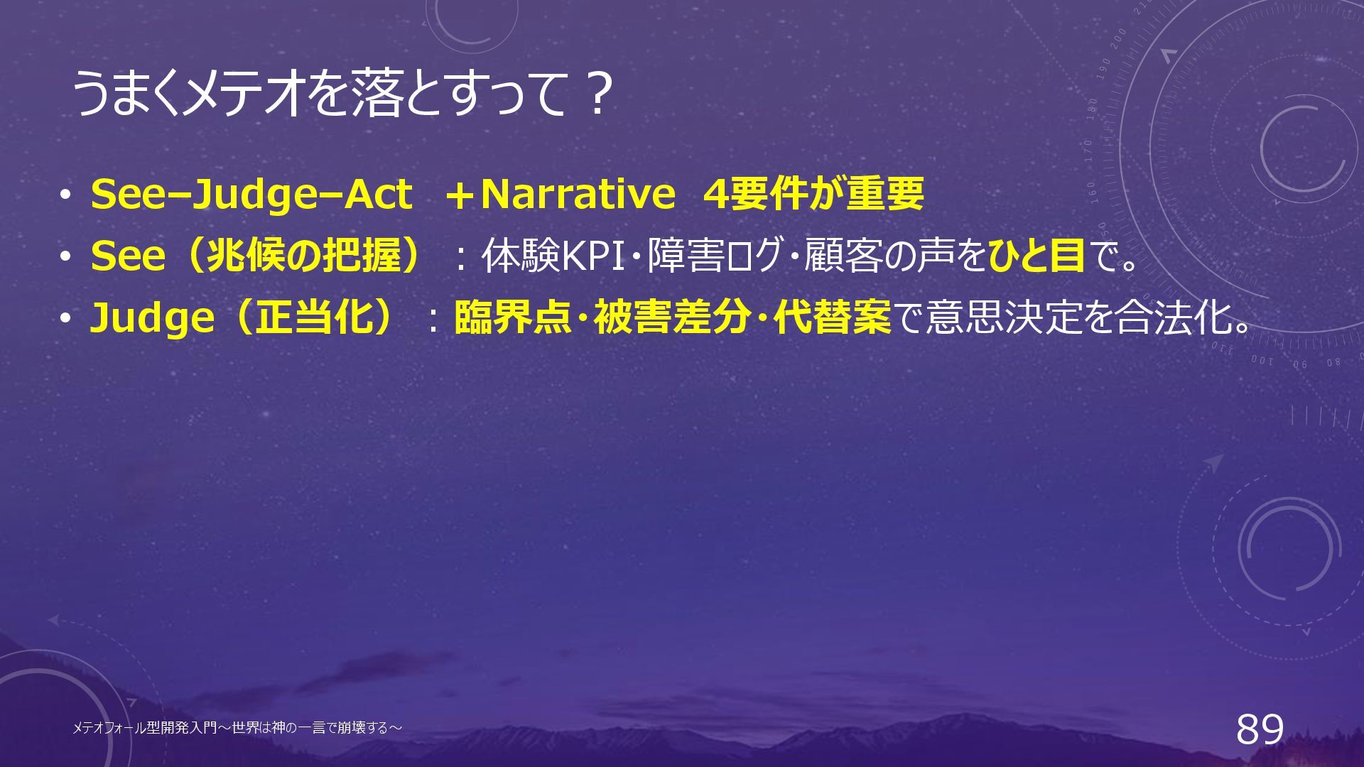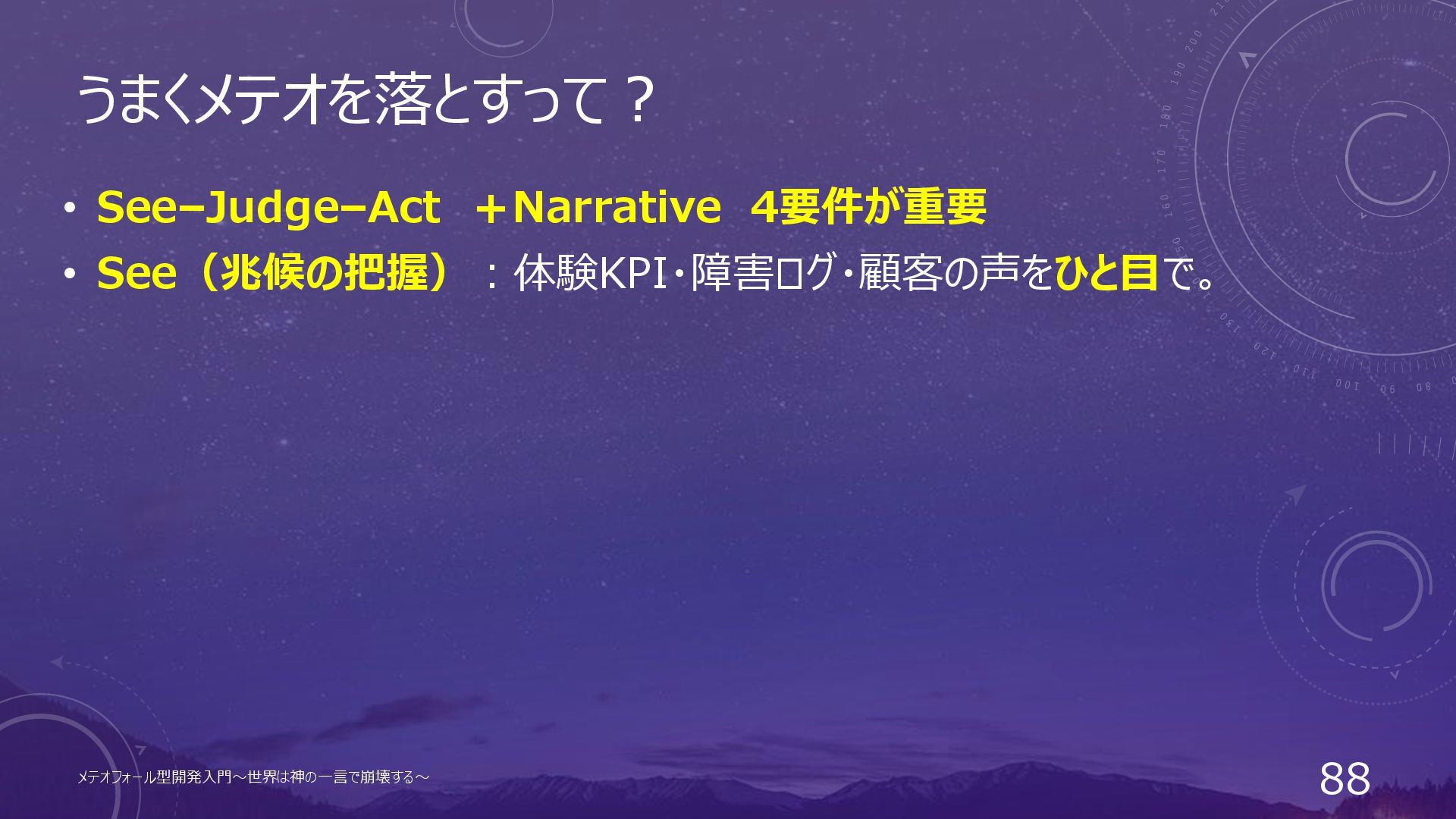 うまくメテオを落とすって? • See–Judge–Act +Narrative 4要件が重要 • See(兆候の把握):体験KPI・障害ログ・顧客の声をひと目で。 メテオフォール型開発入門~世界は神の一言で崩壊する~ 88