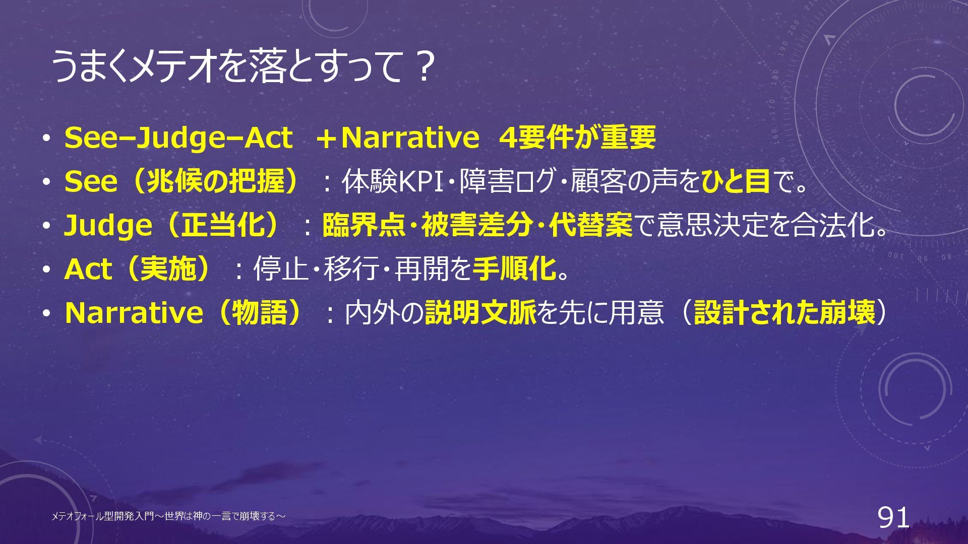 うまくメテオを落とすって? • See–Judge–Act +Narrative 4要件が重要 • See(兆候の把握):体験KPI・障害ログ・顧客の声をひと目で。 • Judge(正当化):臨界点・被害差分・代替案で意思決定を合法化。 メテオフォール型開発入門~世界は神の一言で崩壊する~