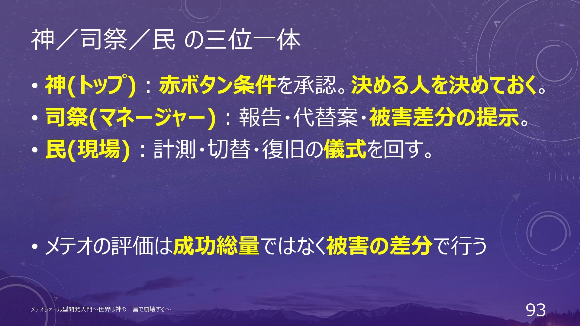 神/司祭/民 の三位一体 • 神(トップ):赤ボタン条件を承認。決める人を決めておく。 • 司祭(マネージャー):報告・代替案・被害差分の提示。 • 民(現場):計測・切替・復旧の儀式を回す。 • メテオの評価は成功総量ではなく被害の差分で行う