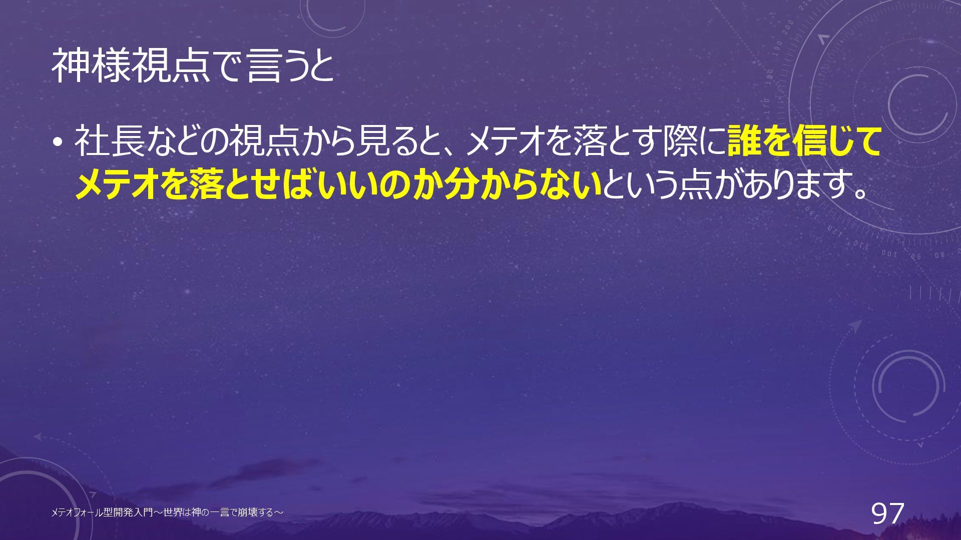 神様視点で言うと • 社長などの視点から見ると、メテオを落とす際に誰を信じて メテオを落とせばいいのか分からないという点があります。 メテオフォール型開発入門~世界は神の一言で崩壊する~ 97