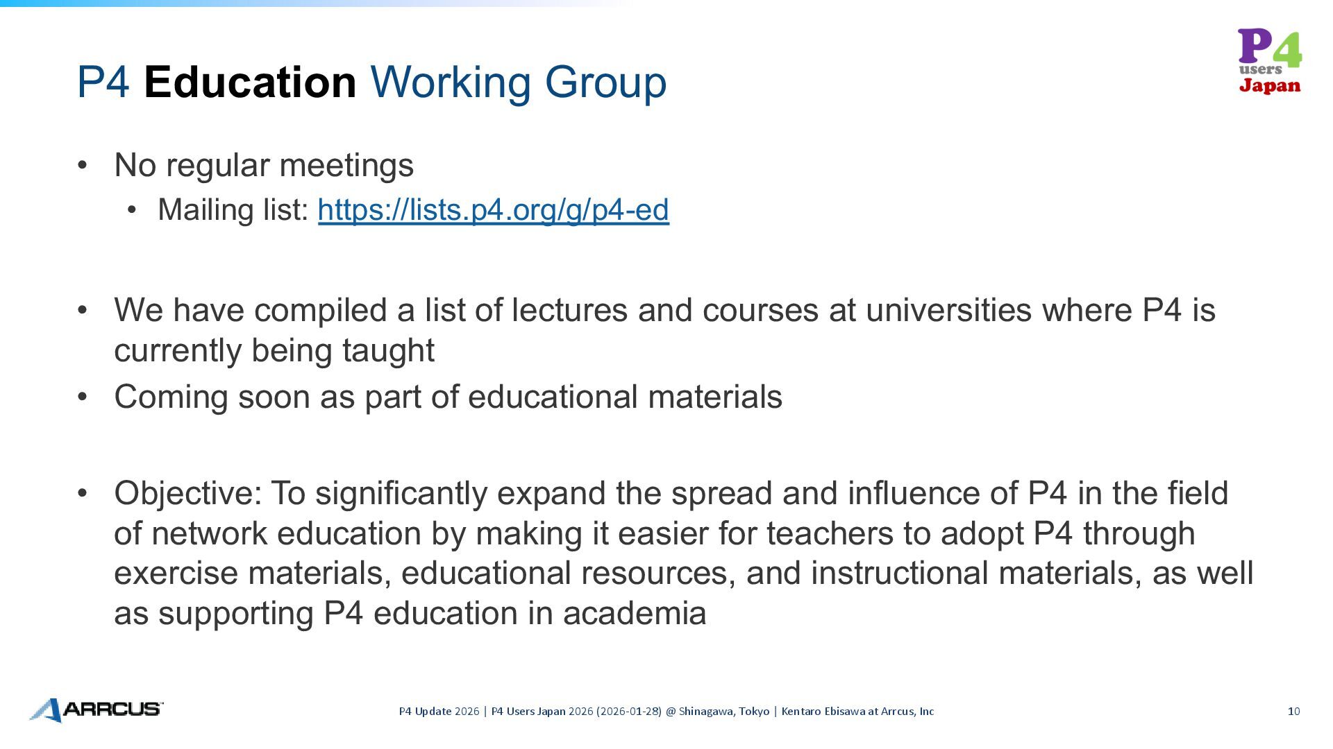 list: https://lists.p4.org/g/p4-ed • We have compiled a list of lectures and courses at universities where P4 is currently being taught • Coming soon as part of educational materials • Objective: To significantly expand the spread and influence of P4 in the field of network education by making it easier for teachers to adopt P4 through exercise materials, educational resources, and instructional materials, as well as supporting P4 education in academia P4 Update 2026 | P4 Users Japan 2026 (2026-01-28) @ Shinagawa, Tokyo | Kentaro Ebisawa at Arrcus, Inc 10