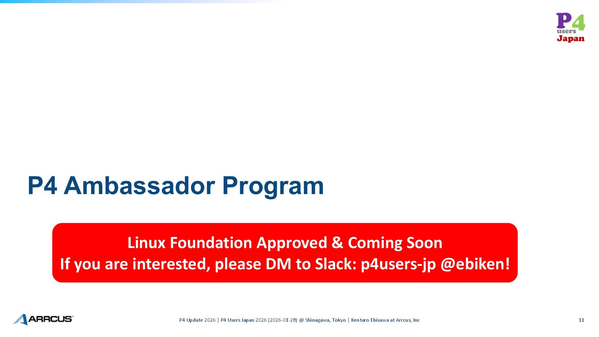 2026 (2026-01-28) @ Shinagawa, Tokyo | Kentaro Ebisawa at Arrcus, Inc 11 Linux Foundation Approved & Coming Soon If you are interested, please DM to Slack: p4users-jp @ebiken!