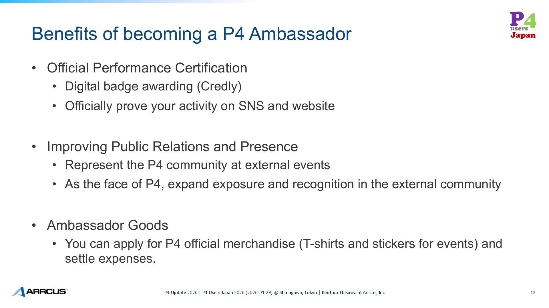 Management • Host online/in-person community events • Information dissemination and content creation • Technical documentation, blog posts to P4.org • Dissemination of news and events on social media • Event Speaking and Representative Activities • Exhibiting at the P4 booth and taking the stage as a speaker • Community Expansion and Support • Developing, welcoming, and developing new contributors and members • Connecting diverse talents in the region to build inclusive communities P4 Update 2026 | P4 Users Japan 2026 (2026-01-28) @ Shinagawa, Tokyo | Kentaro Ebisawa at Arrcus, Inc 12