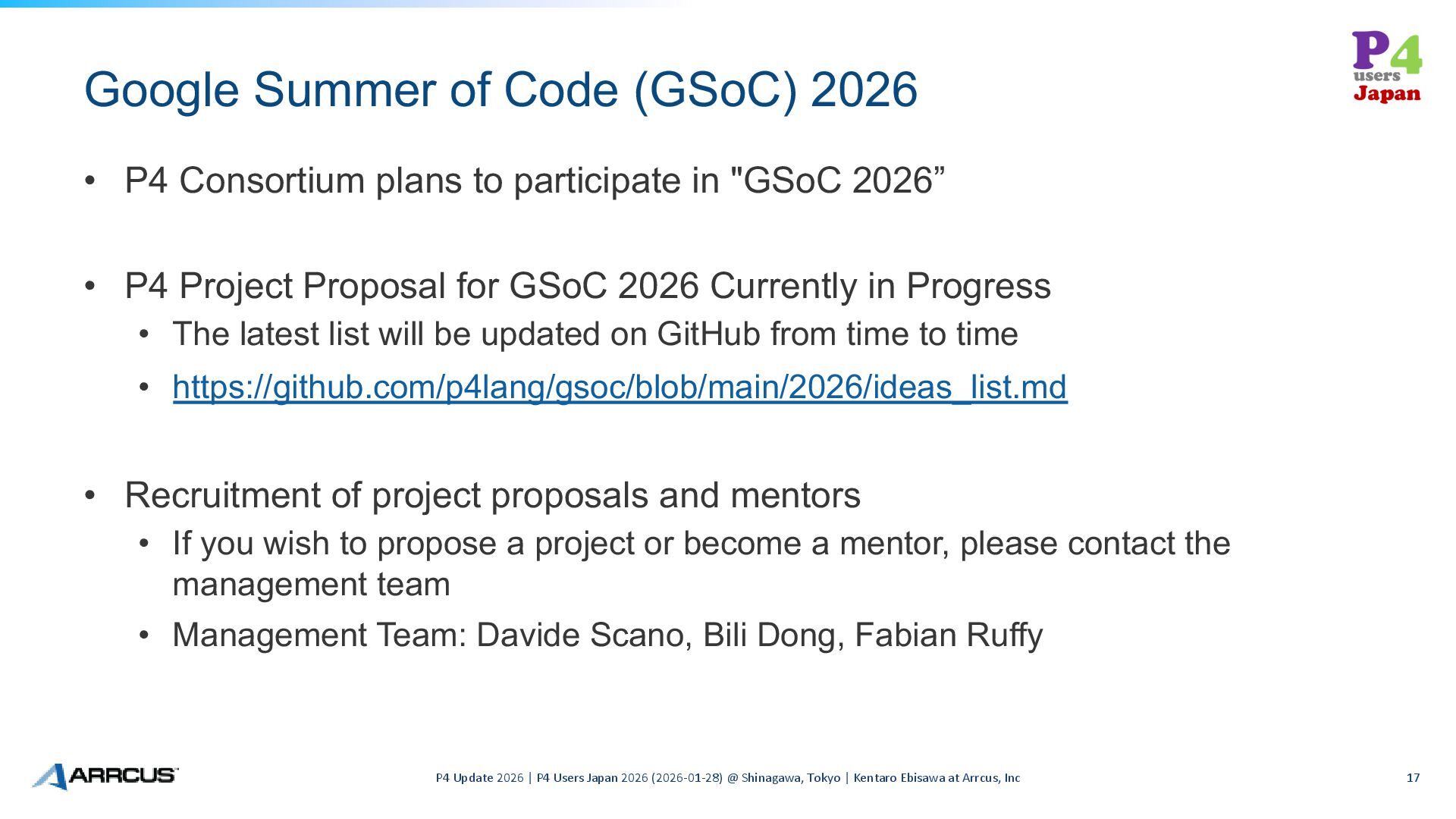 to participate in "GSoC 2026” • P4 Project Proposal for GSoC 2026 Currently in Progress • The latest list will be updated on GitHub from time to time • https://github.com/p4lang/gsoc/blob/main/2026/ideas_list.md • Recruitment of project proposals and mentors • If you wish to propose a project or become a mentor, please contact the management team • Management Team: Davide Scano, Bili Dong, Fabian Ruffy P4 Update 2026 | P4 Users Japan 2026 (2026-01-28) @ Shinagawa, Tokyo | Kentaro Ebisawa at Arrcus, Inc 17