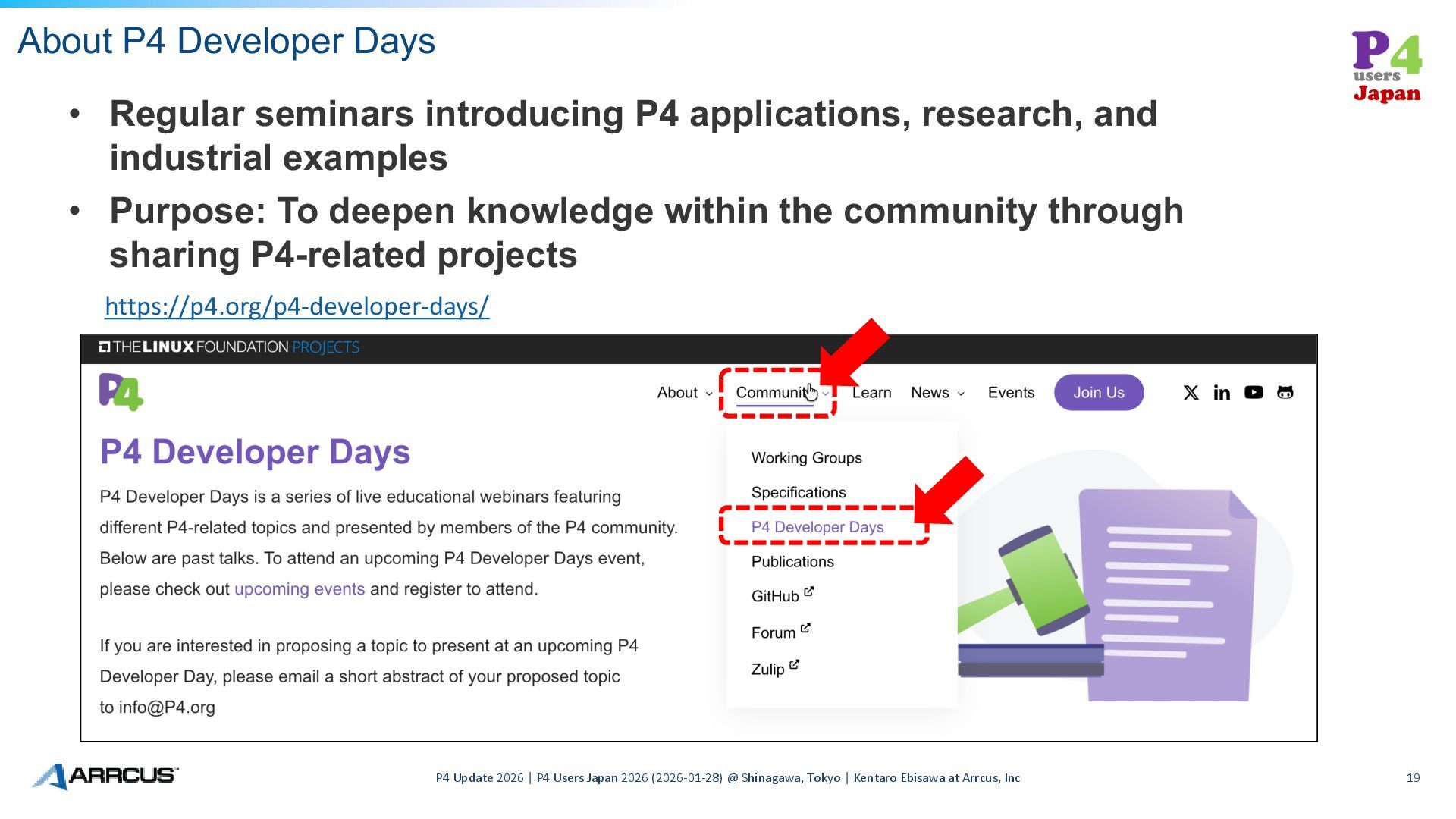 Japan 2026 (2026-01-28) @ Shinagawa, Tokyo | Kentaro Ebisawa at Arrcus, Inc 19 • Regular seminars introducing P4 applications, research, and industrial examples • Purpose: To deepen knowledge within the community through sharing P4-related projects https://p4.org/p4-developer-days/