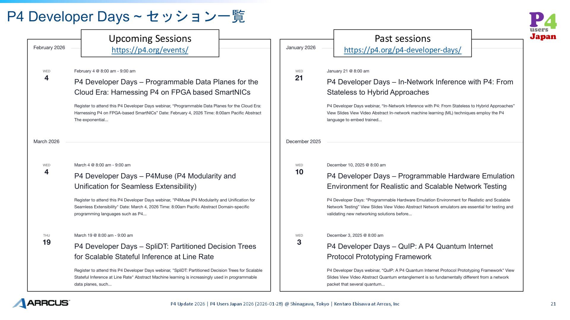 Users Japan 2026 (2026-01-28) @ Shinagawa, Tokyo | Kentaro Ebisawa at Arrcus, Inc 21 Upcoming Sessions https://p4.org/events/ Past sessions https://p4.org/p4-developer-days/