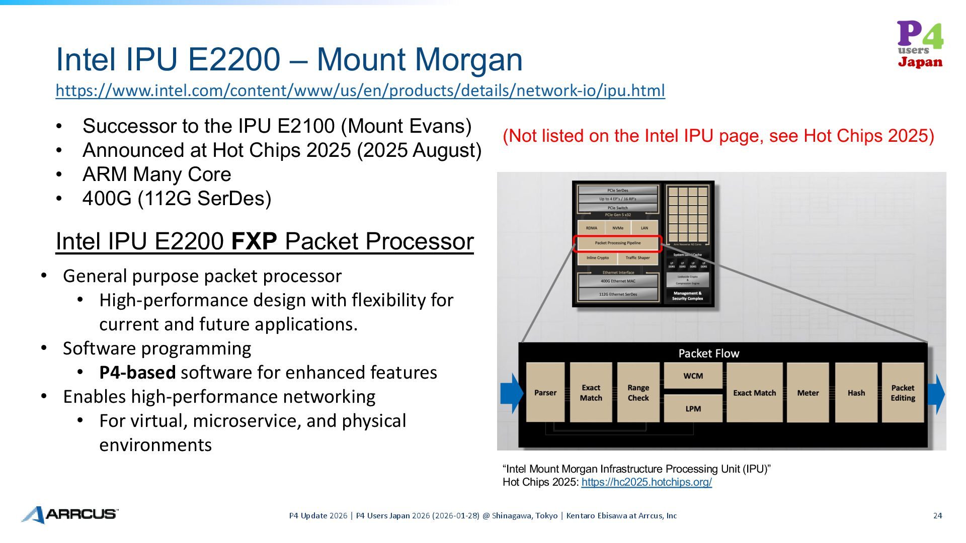 P4 Users Japan 2026 (2026-01-28) @ Shinagawa, Tokyo | Kentaro Ebisawa at Arrcus, Inc 24 Intel IPU E2200 FXP Packet Processor “Intel Mount Morgan Infrastructure Processing Unit (IPU)” Hot Chips 2025: https://hc2025.hotchips.org/ • General purpose packet processor • High-performance design with flexibility for current and future applications. • Software programming • P4-based software for enhanced features • Enables high-performance networking • For virtual, microservice, and physical environments • Successor to the IPU E2100 (Mount Evans) • Announced at Hot Chips 2025 (2025 August) • ARM Many Core • 400G (112G SerDes) https://www.intel.com/content/www/us/en/products/details/network-io/ipu.html (Not listed on the Intel IPU page, see Hot Chips 2025)