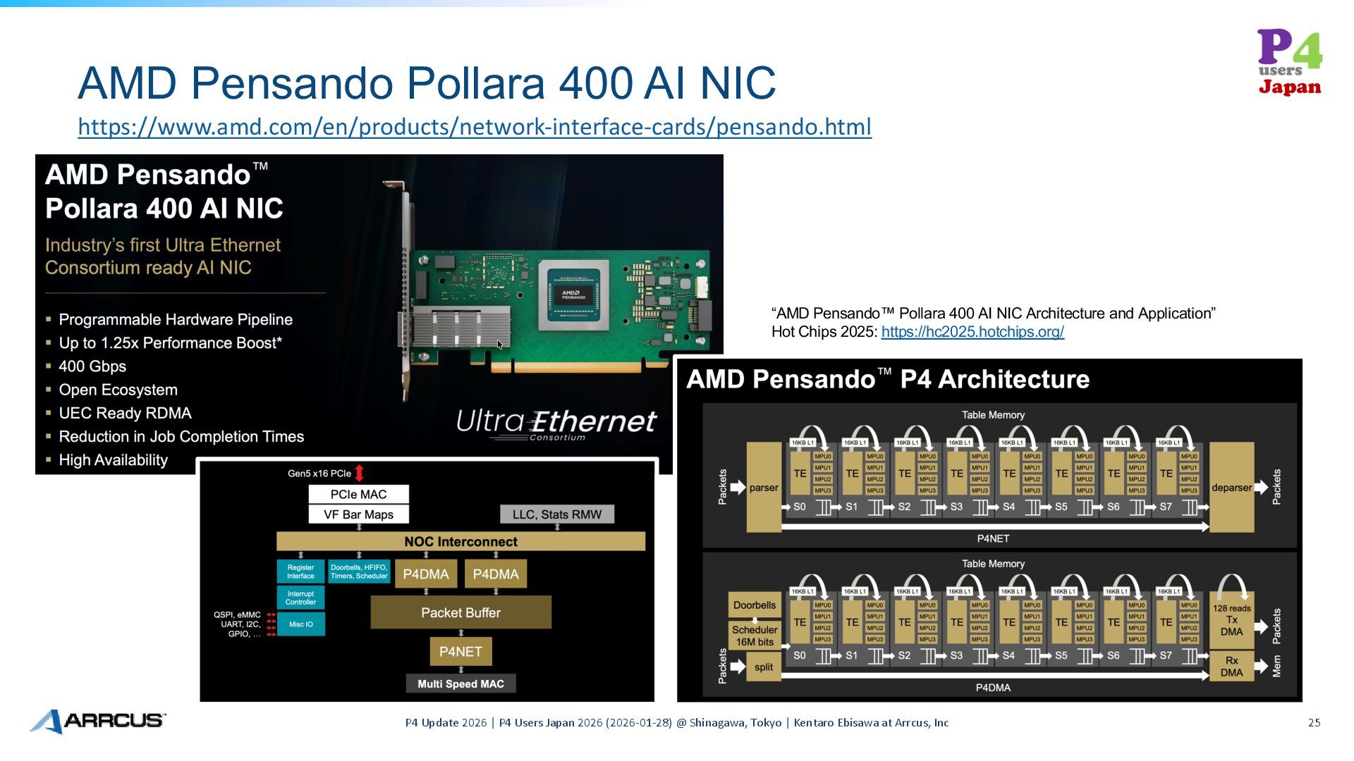 P4 Users Japan 2026 (2026-01-28) @ Shinagawa, Tokyo | Kentaro Ebisawa at Arrcus, Inc 25 https://www.amd.com/en/products/network-interface-cards/pensando.html “AMD Pensando™ Pollara 400 AI NIC Architecture and Application” Hot Chips 2025: https://hc2025.hotchips.org/