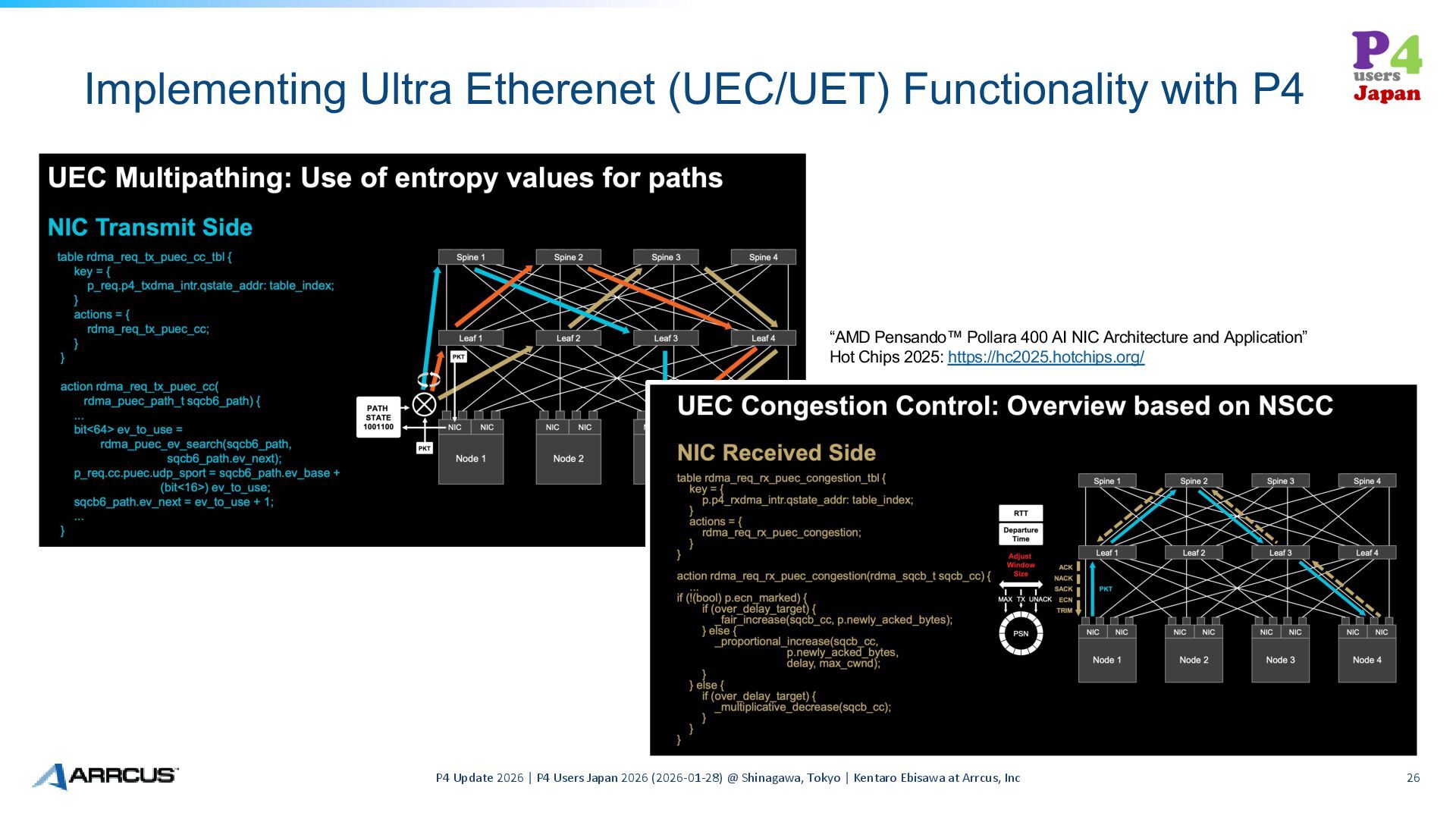 | P4 Users Japan 2026 (2026-01-28) @ Shinagawa, Tokyo | Kentaro Ebisawa at Arrcus, Inc 26 “AMD Pensando™ Pollara 400 AI NIC Architecture and Application” Hot Chips 2025: https://hc2025.hotchips.org/