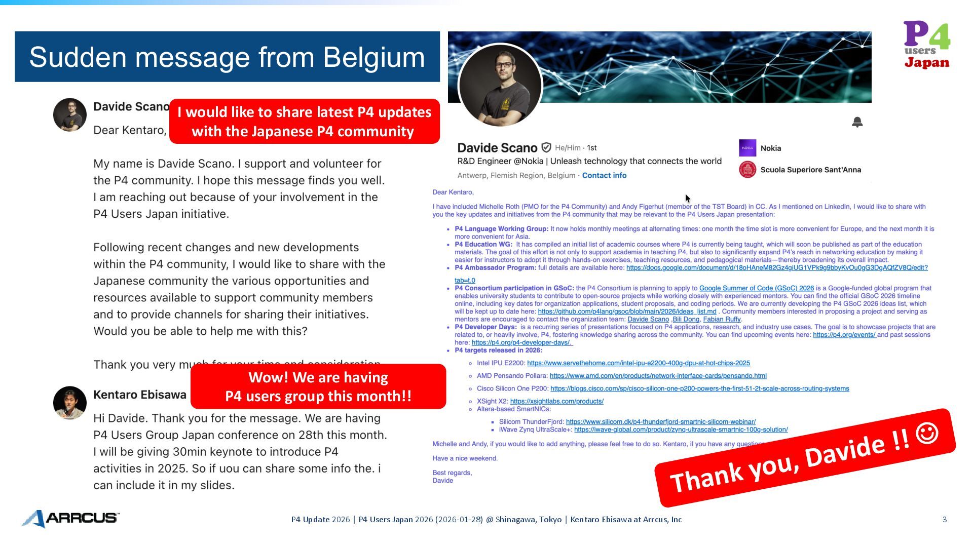 Shinagawa, Tokyo | Kentaro Ebisawa at Arrcus, Inc 3 Sudden message from Belgium Thank you, Davide !! J I would like to share latest P4 updates with the Japanese P4 community Wow! We are having P4 users group this month!!