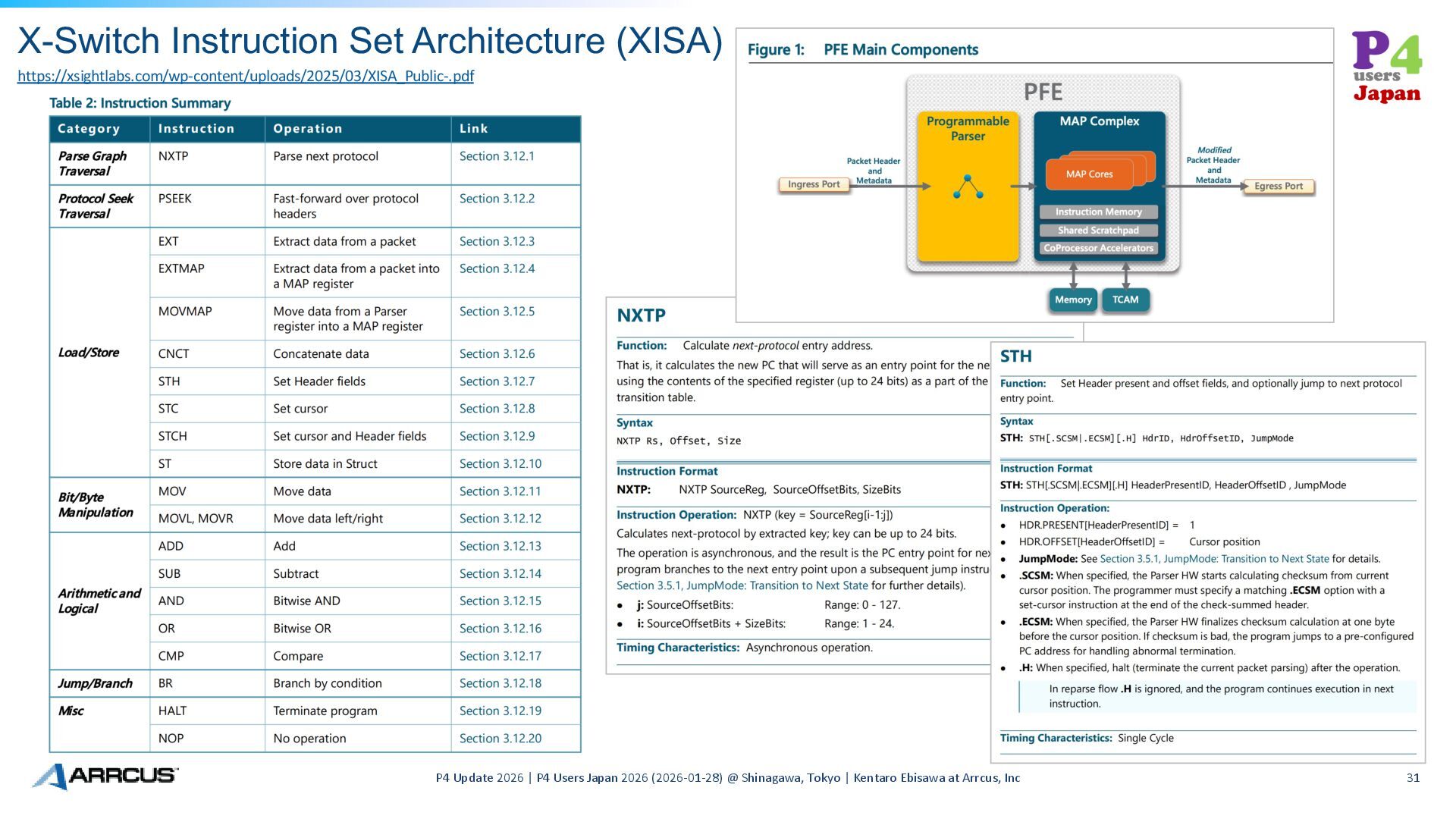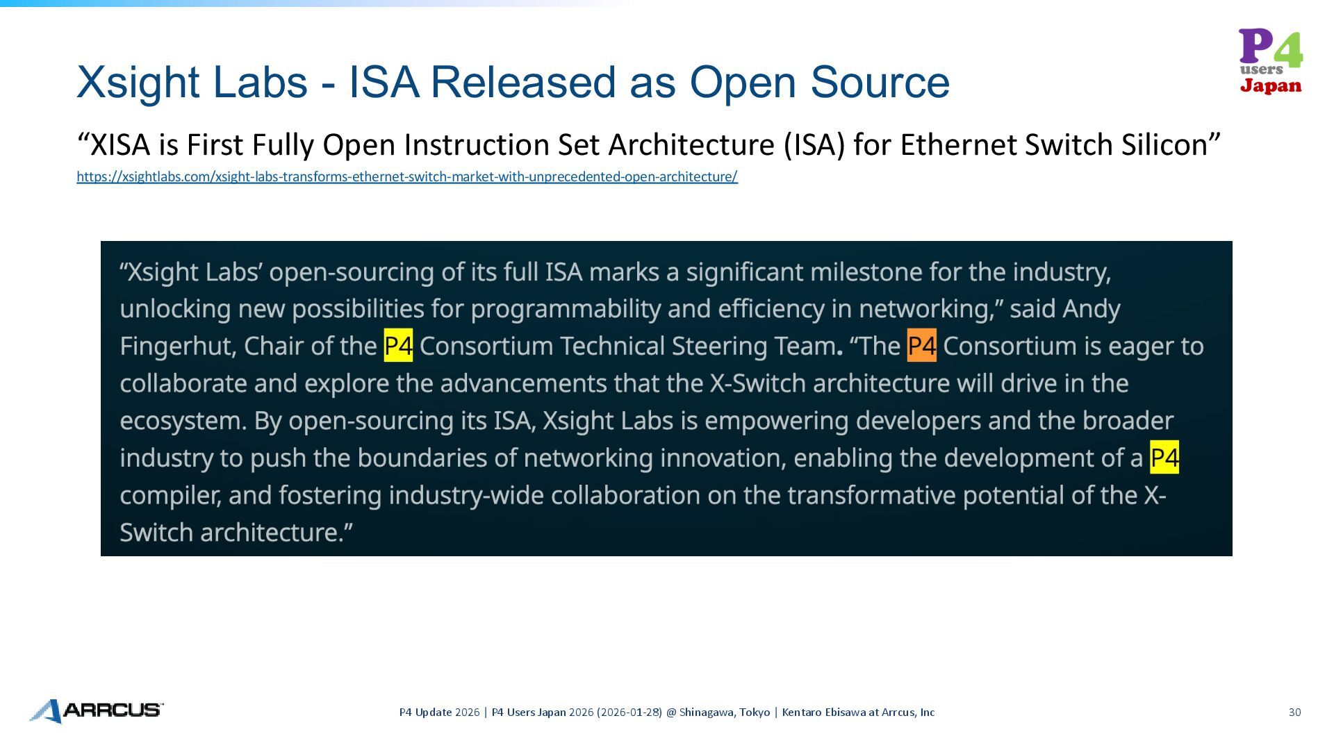 2026 | P4 Users Japan 2026 (2026-01-28) @ Shinagawa, Tokyo | Kentaro Ebisawa at Arrcus, Inc 30 “XISA is First Fully Open Instruction Set Architecture (ISA) for Ethernet Switch Silicon” https://xsightlabs.com/xsight-labs-transforms-ethernet-switch-market-with-unprecedented-open-architecture/