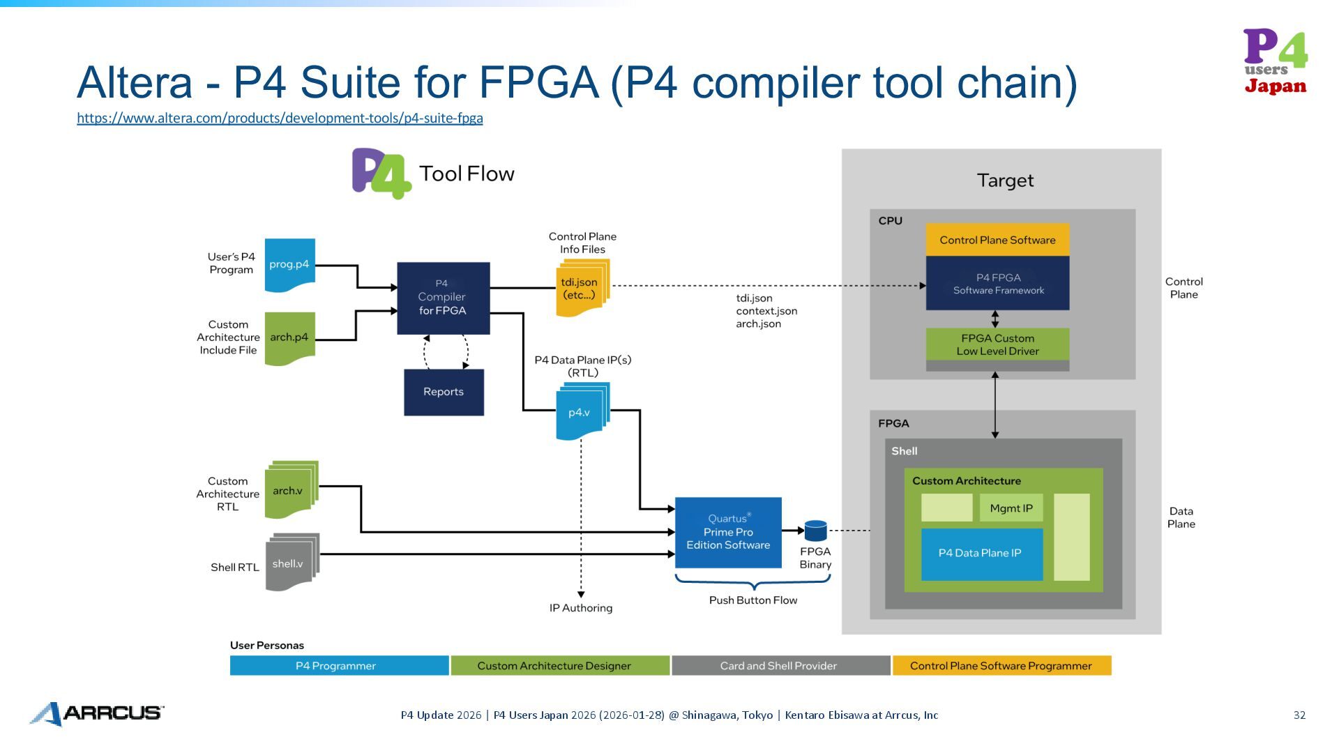 P4 Update 2026 | P4 Users Japan 2026 (2026-01-28) @ Shinagawa, Tokyo | Kentaro Ebisawa at Arrcus, Inc 32 https://www.altera.com/products/development-tools/p4-suite-fpga