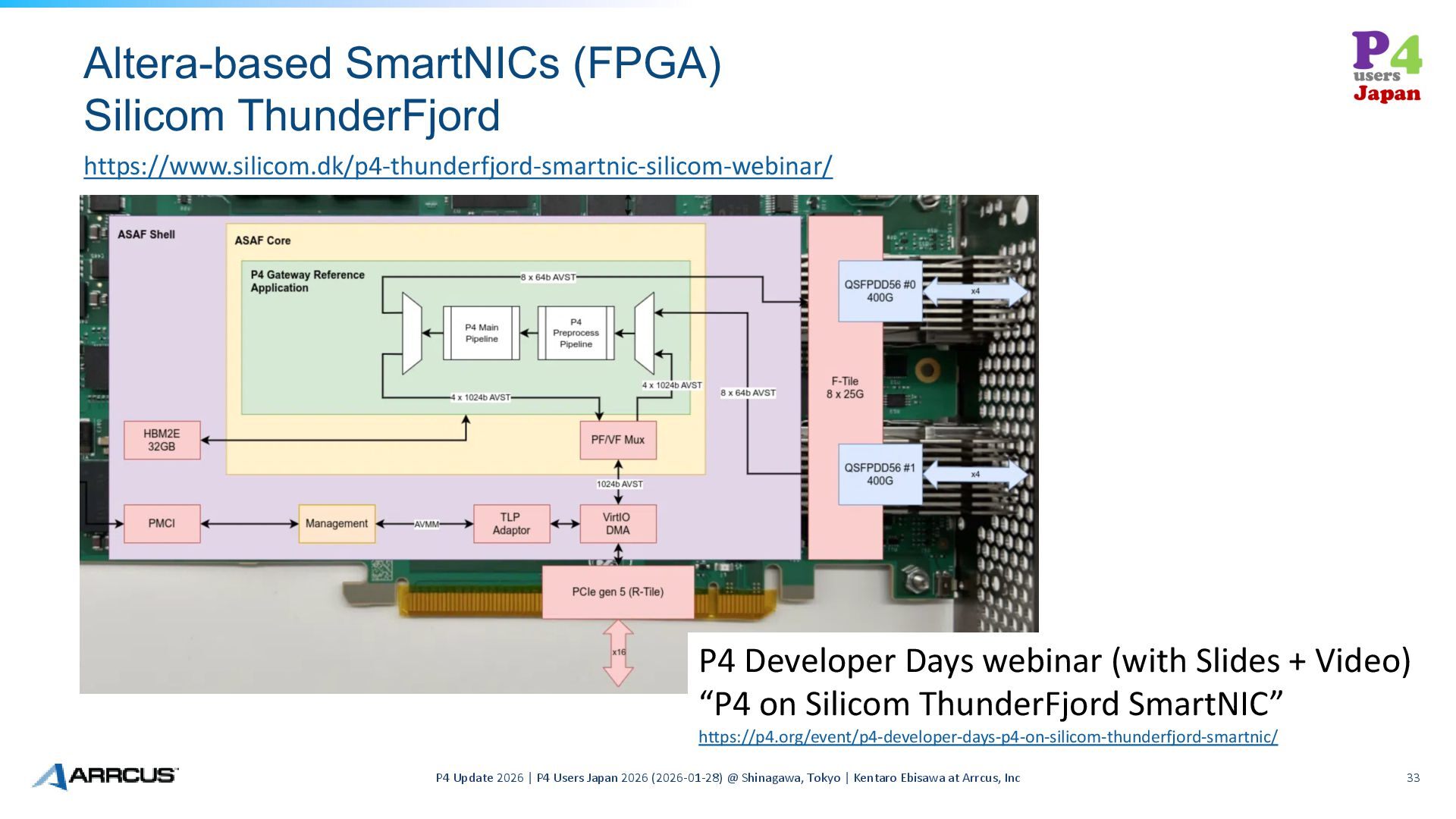Users Japan 2026 (2026-01-28) @ Shinagawa, Tokyo | Kentaro Ebisawa at Arrcus, Inc 33 https://www.silicom.dk/p4-thunderfjord-smartnic-silicom-webinar/ P4 Developer Days webinar (with Slides + Video) “P4 on Silicom ThunderFjord SmartNIC” https://p4.org/event/p4-developer-days-p4-on-silicom-thunderfjord-smartnic/