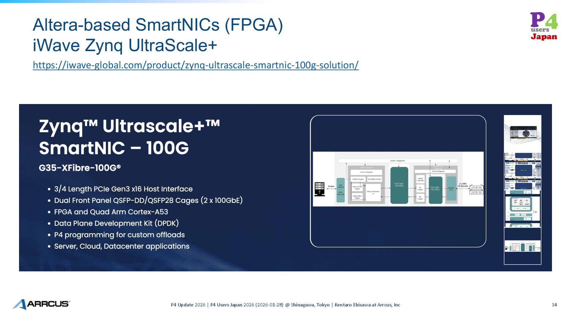 P4 Users Japan 2026 (2026-01-28) @ Shinagawa, Tokyo | Kentaro Ebisawa at Arrcus, Inc 34 https://iwave-global.com/product/zynq-ultrascale-smartnic-100g-solution/