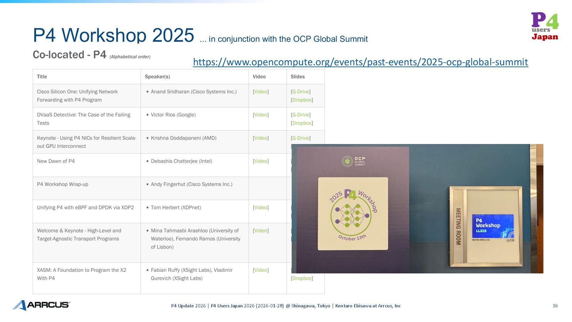 Summit P4 Update 2026 | P4 Users Japan 2026 (2026-01-28) @ Shinagawa, Tokyo | Kentaro Ebisawa at Arrcus, Inc 36 https://www.opencompute.org/events/past-events/2025-ocp-global-summit