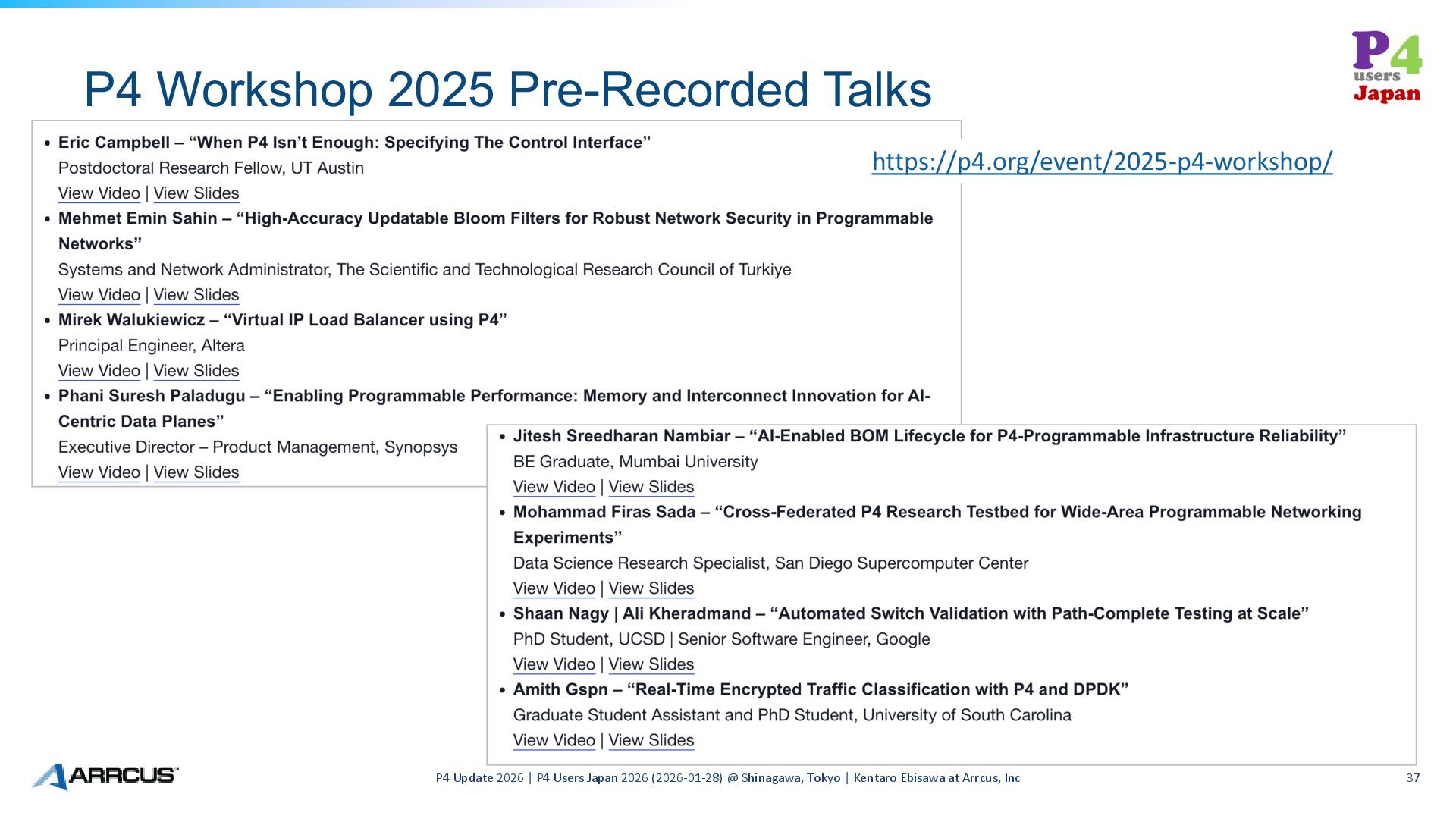 Users Japan 2026 (2026-01-28) @ Shinagawa, Tokyo | Kentaro Ebisawa at Arrcus, Inc 37 https://p4.org/event/2025-p4-workshop/