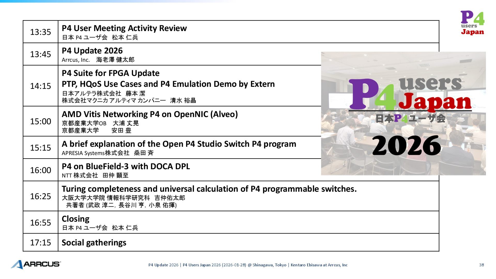 Shinagawa, Tokyo | Kentaro Ebisawa at Arrcus, Inc 38 13:35 P4 User Meeting Activity Review 日本 P4 ユーザ会 松本 仁兵 13:45 P4 Update 2026 Arrcus, Inc. 海老澤 健太郎 14:15 P4 Suite for FPGA Update PTP, HQoS Use Cases and P4 Emulation Demo by Extern 日本アルテラ株式会社 藤本 潔 株式会社マクニカ アルティマ カンパニー 清水 裕晶 15:00 AMD Vitis Networking P4 on OpenNIC (Alveo) 京都産業大学OB 大浦 丈晃 京都産業大学 安田 豊 15:15 A brief explanation of the Open P4 Studio Switch P4 program APRESIA Systems株式会社 桑田 斉 16:00 P4 on BlueField-3 with DOCA DPL NTT 株式会社 田仲 顕至 16:25 Turing completeness and universal calculation of P4 programmable switches. 大阪大学大学院 情報科学研究科 吉仲佑太郎 共著者 (武政 淳二,長谷川 亨,小泉 佑揮) 16:55 Closing 日本 P4 ユーザ会 松本 仁兵 17:15 Social gatherings