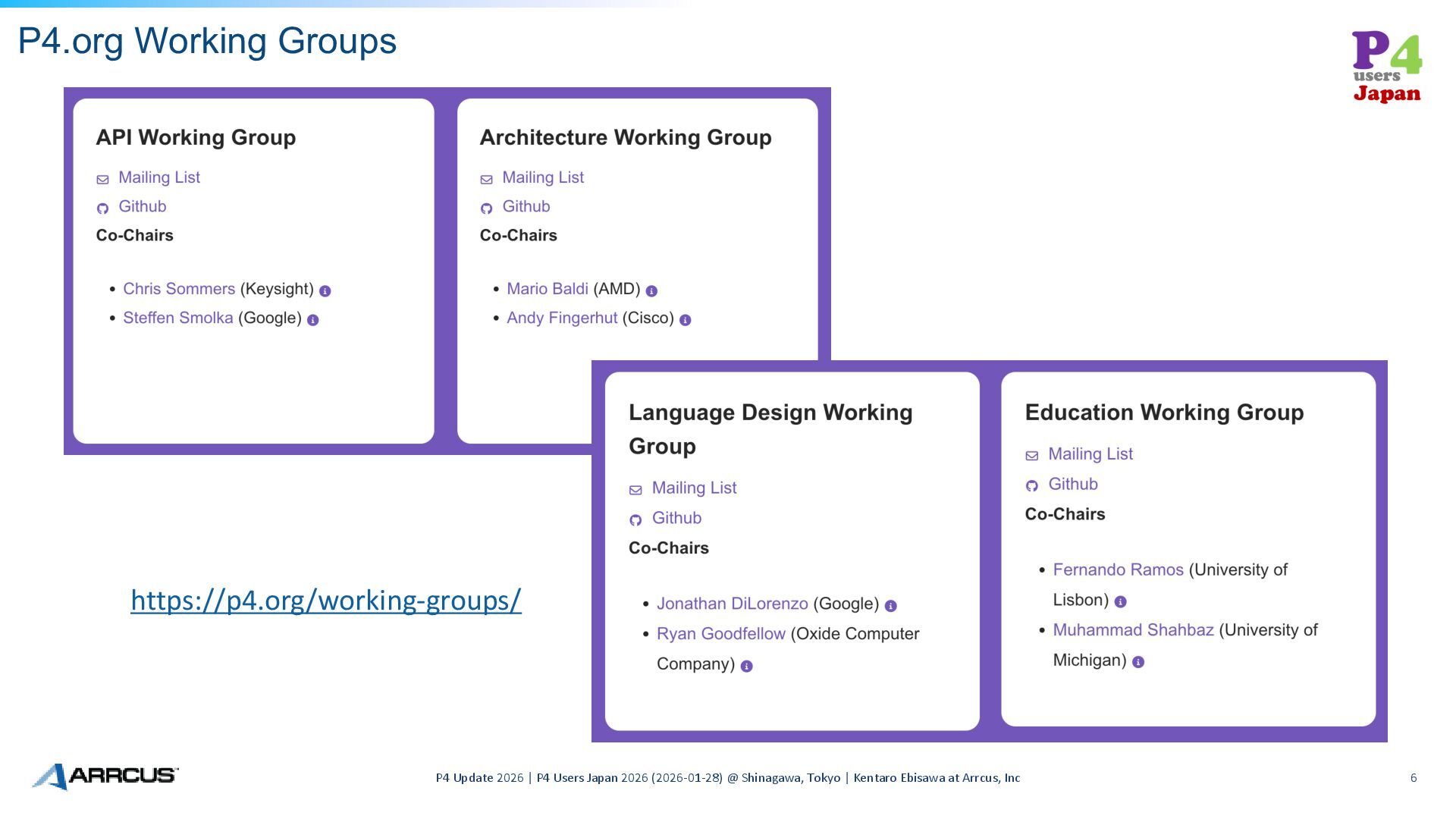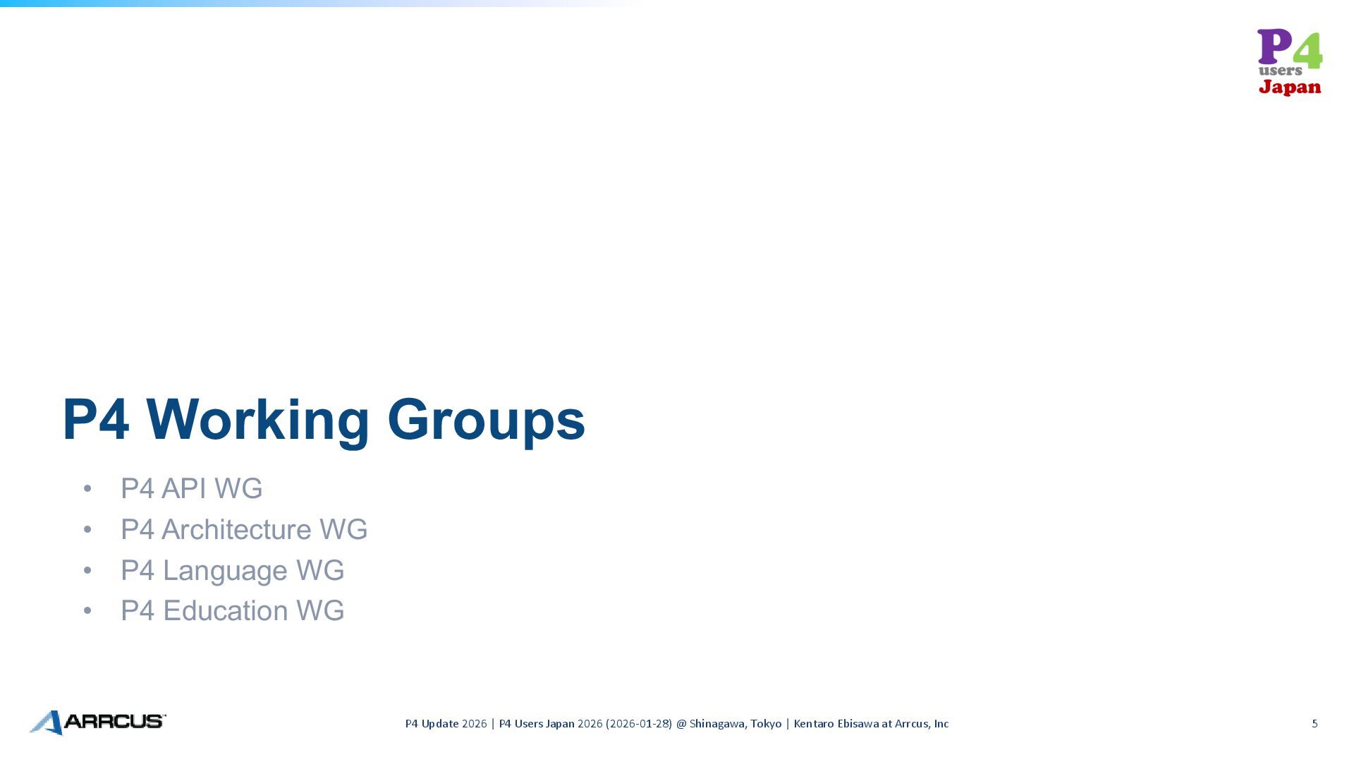 WG • P4 Language WG • P4 Education WG P4 Update 2026 | P4 Users Japan 2026 (2026-01-28) @ Shinagawa, Tokyo | Kentaro Ebisawa at Arrcus, Inc 5