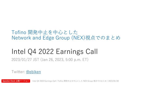 北米時間 2023年1月26日 の Intel Q4 2022 Earnings Call にて "we will end future investment on our network switching product line" と言及され、実質の Tofino Switch ASIC 製品ラインの開発中止が発表されたため、そのアナウンスを受け、今後のデータプレーンプログラマビリティについて考察をまとめました。