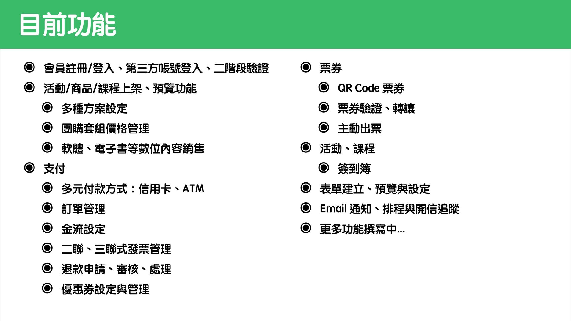 軟體、電子書等數位內容銷售 ๏ 支付 ๏ 多元付款方式 : 信用卡、ATM ๏ 訂單管理 ๏ 金流設定 ๏ 二聯、三聯式發票管理 ๏ 退款申請、審核、處理 ๏ 優惠券設定與管理 ๏ 票券 ๏ QR Code 票券 ๏ 票券驗證、轉讓 ๏ 主動出票 ๏ 活動、課程 ๏ 簽到簿 ๏ 表單建立、預覽與設定 ๏ Email 通知、排程與開信追蹤 ๏ 更多功能撰寫中...