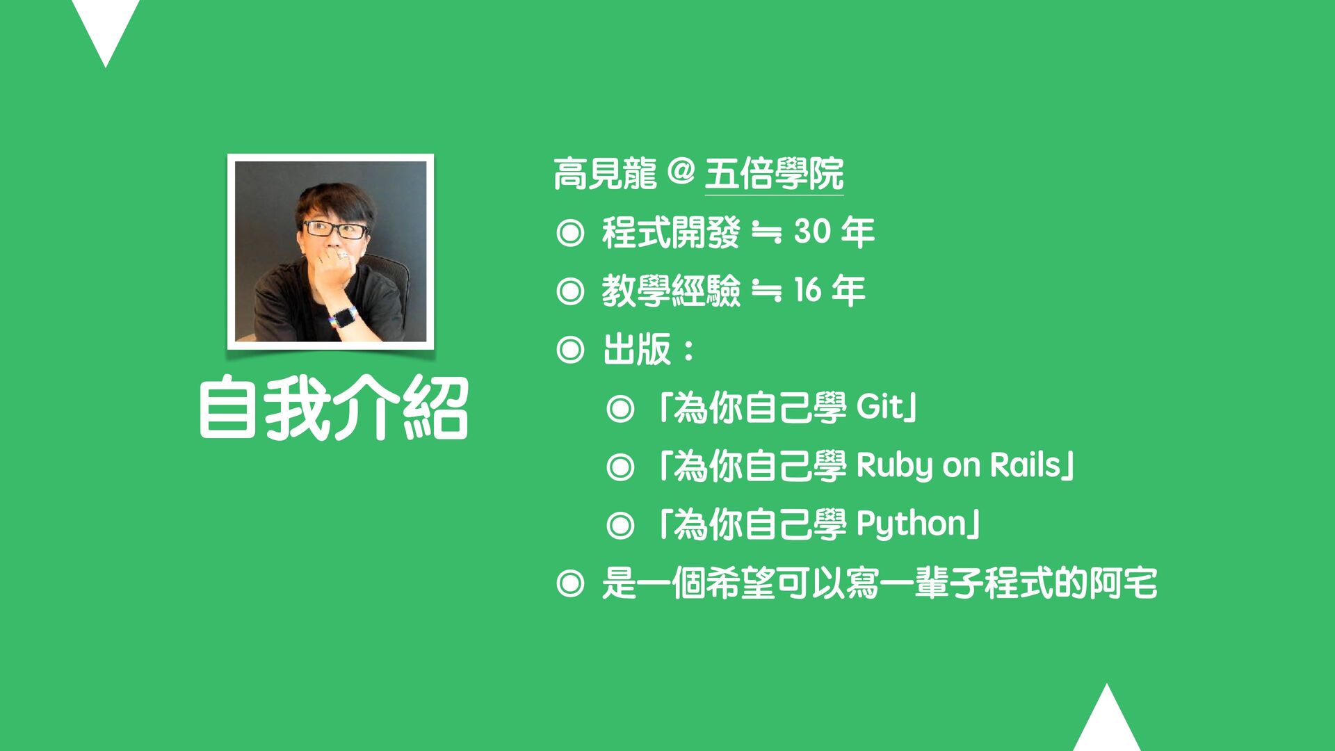 教學經驗 ≒ 16 年 ๏ 出版 : ๏「為你自己學 Git」 ๏「為你自己學 Ruby on Rails」 ๏「為你自己學 Python」 ๏ 是一個希望可以寫一輩子程式的阿宅
