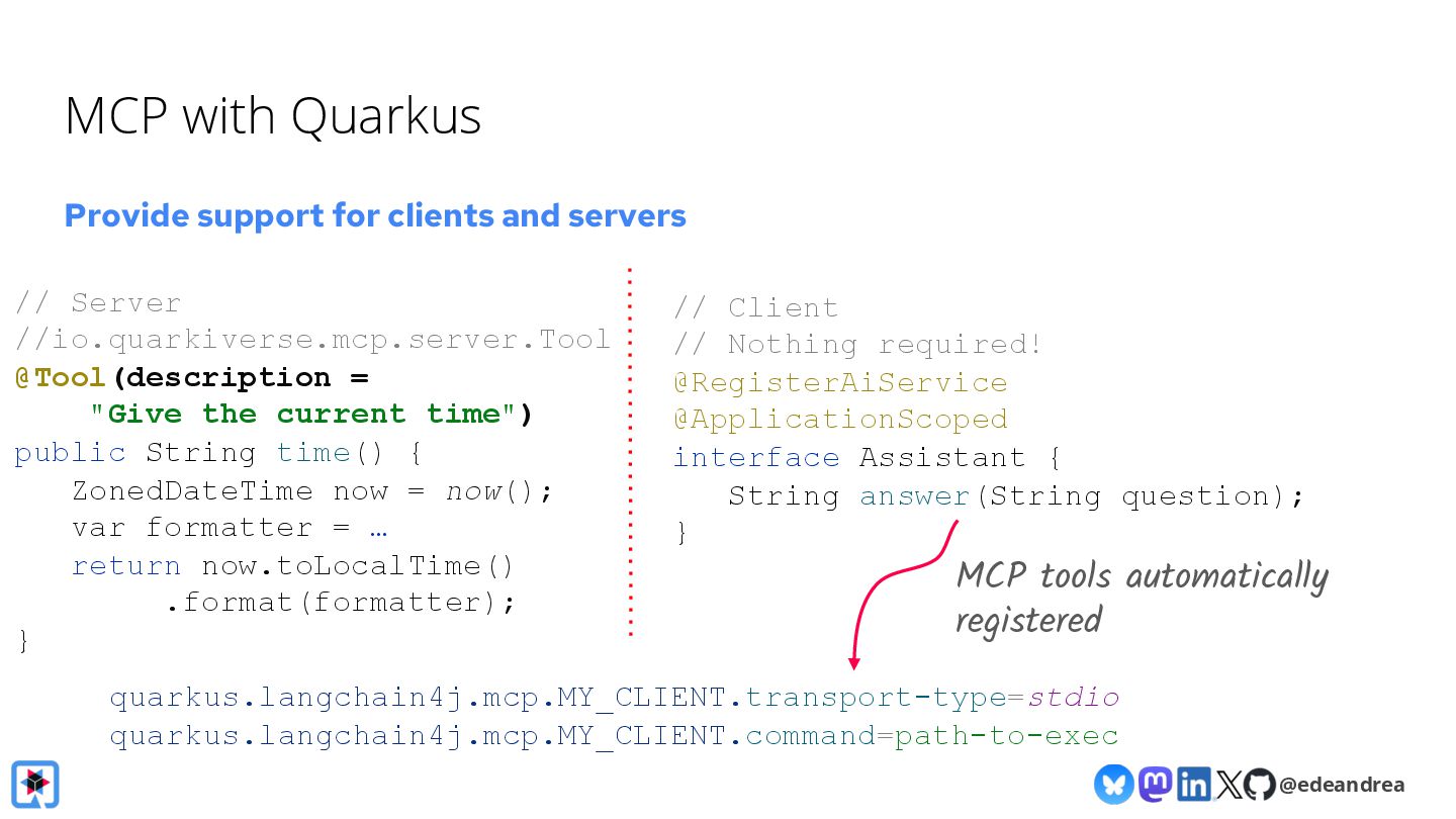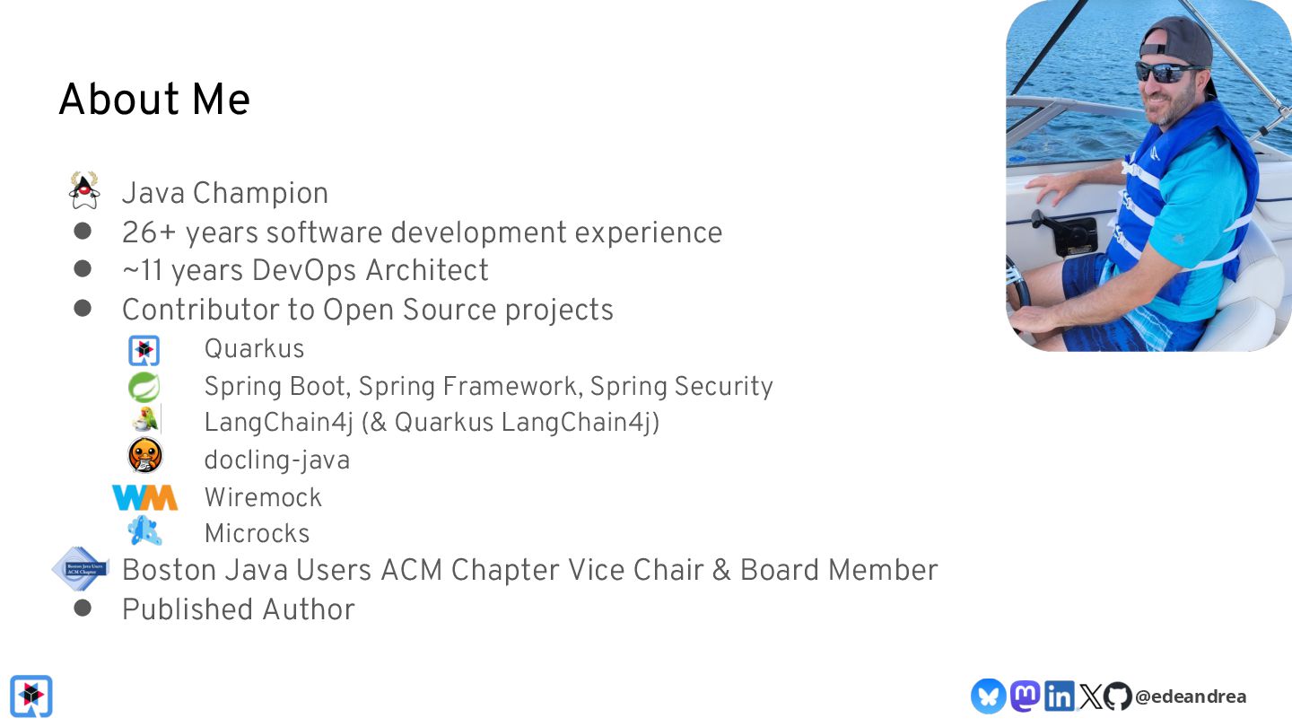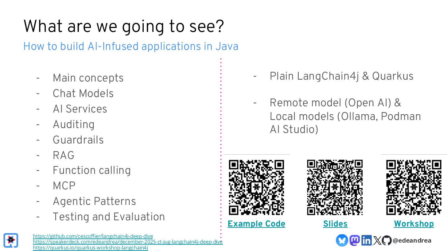 Then, we take a deeper dive into the Quarkus LangChain4j integration. We'll show how little code is needed when using Quarkus, how live reload makes experimenting with prompts a breeze and finally, we'll look at its native image generation capabilities, aiming to get your AI-powered app deployment-ready in no time.