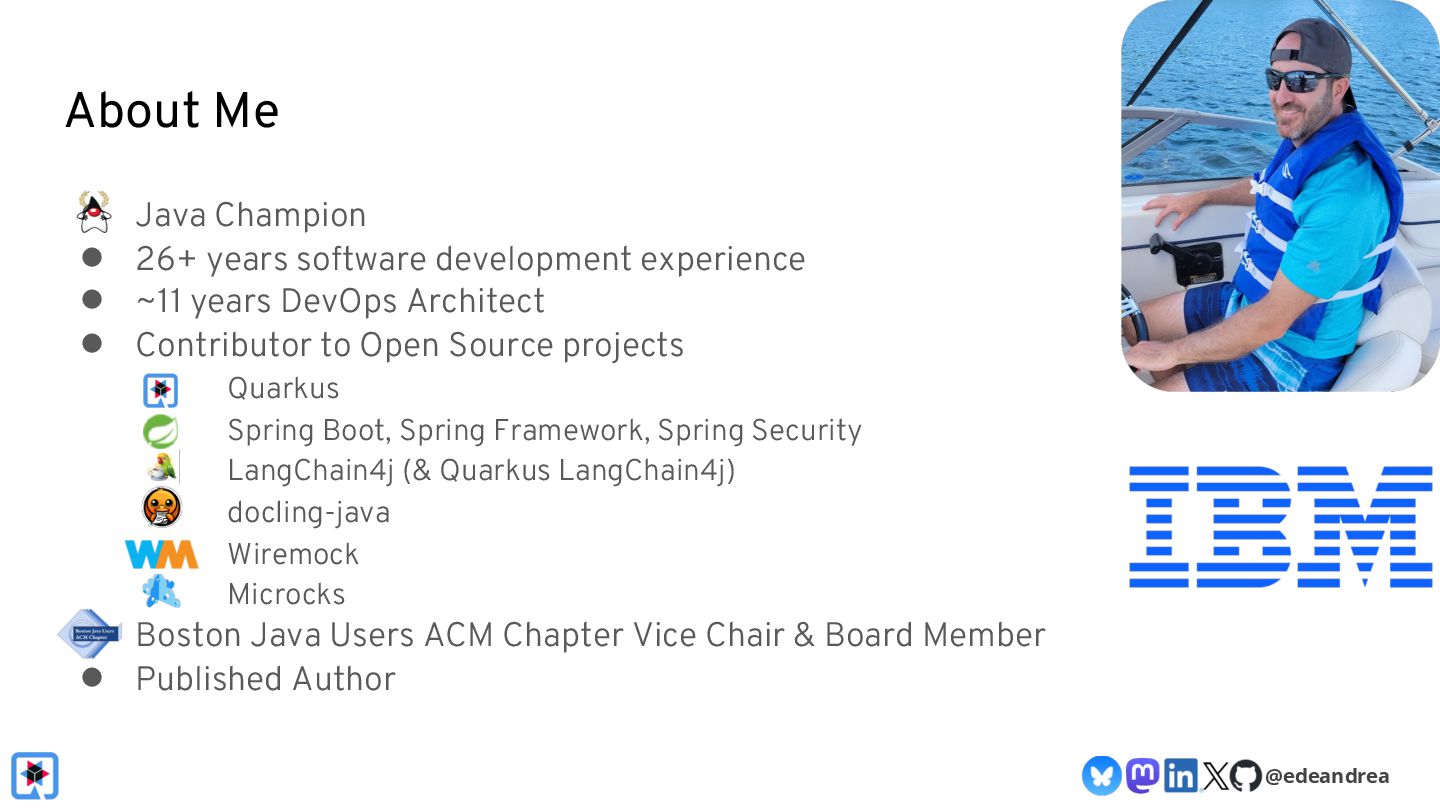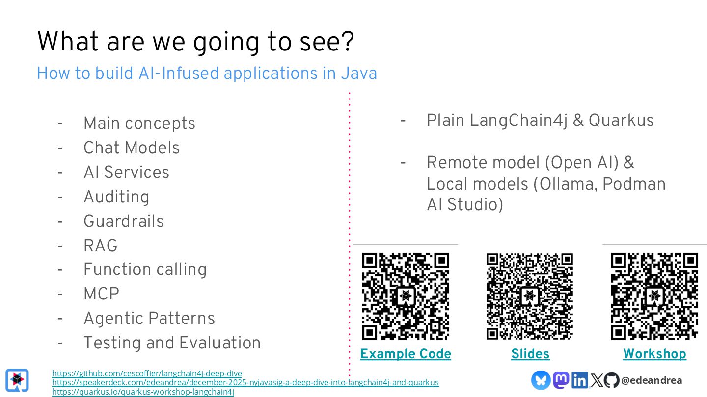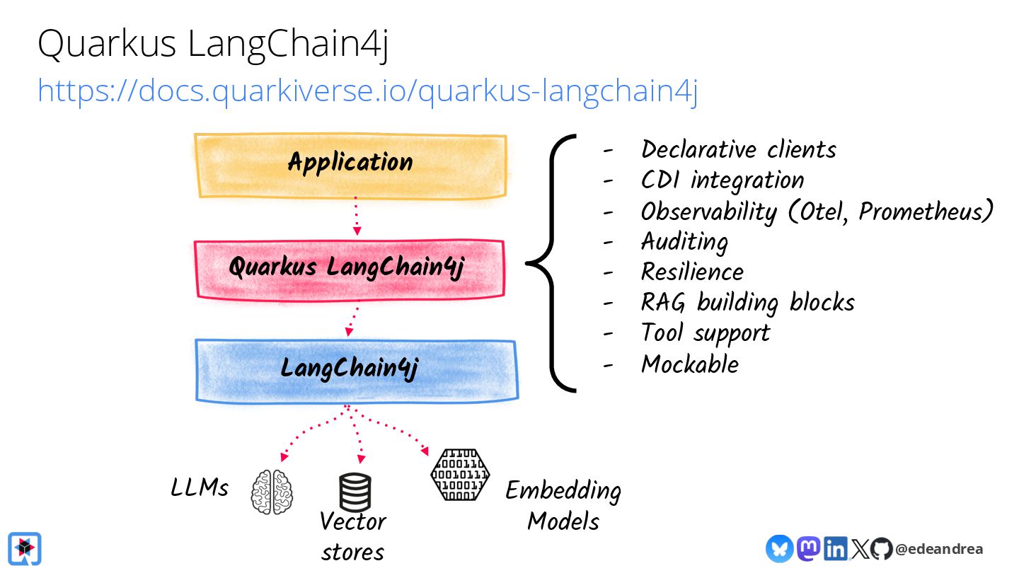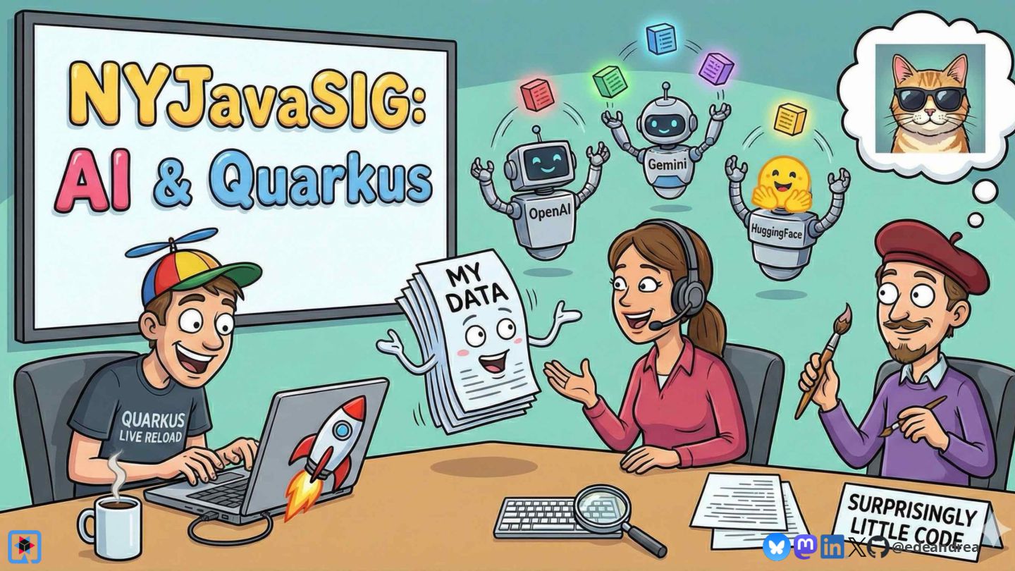 Discover how to seamlessly integrate major LLMs (OpenAI, Gemini, HuggingFace), generate AI images, and master advanced RAG patterns to chat with your own data. We’ll also take a deep dive into Quarkus integration, demonstrating how to leverage live reload for rapid, prompt experimentation and build native images for lightning-fast deployments. Join us to learn how to go from concept to a production-ready, AI-powered application with surprisingly little code.