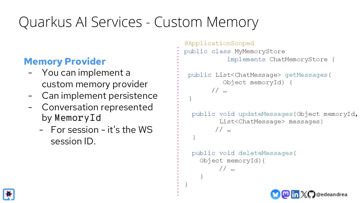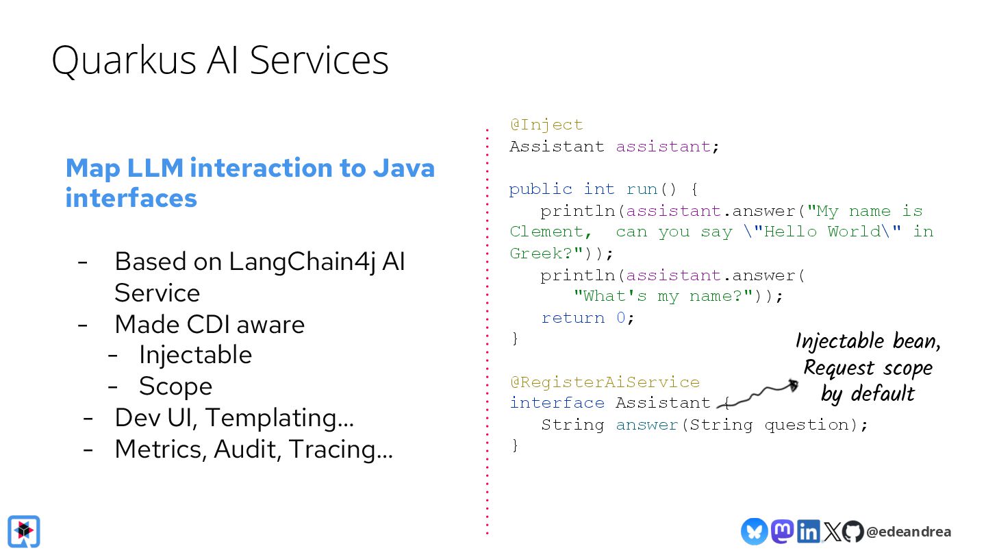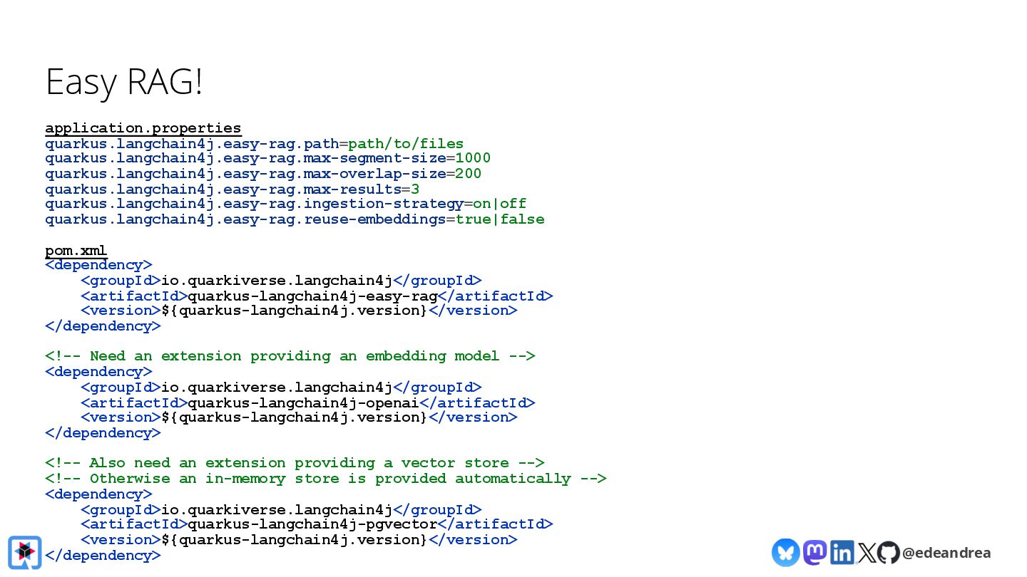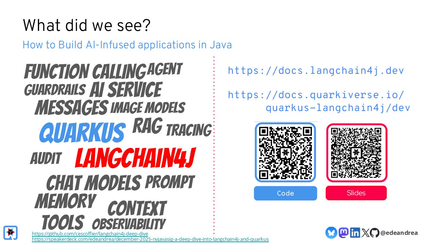 Discover how to seamlessly integrate major LLMs (OpenAI, Gemini, HuggingFace), generate AI images, and master advanced RAG patterns to chat with your own data. We’ll also take a deep dive into Quarkus integration, demonstrating how to leverage live reload for rapid, prompt experimentation and build native images for lightning-fast deployments. Join us to learn how to go from concept to a production-ready, AI-powered application with surprisingly little code.