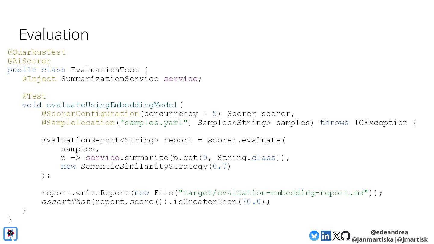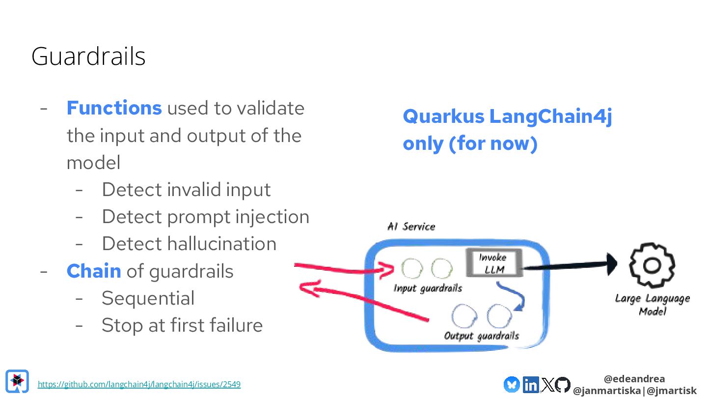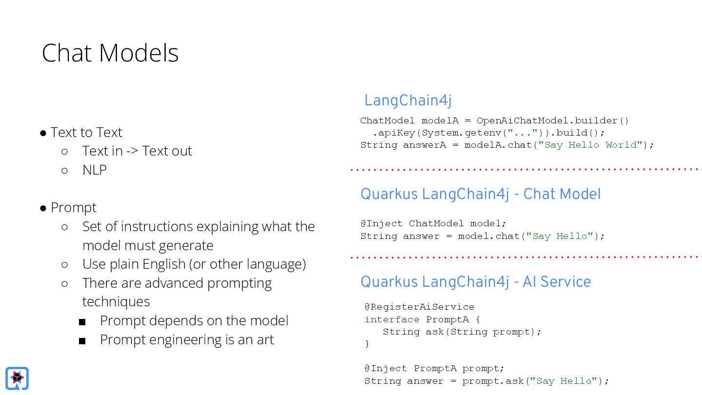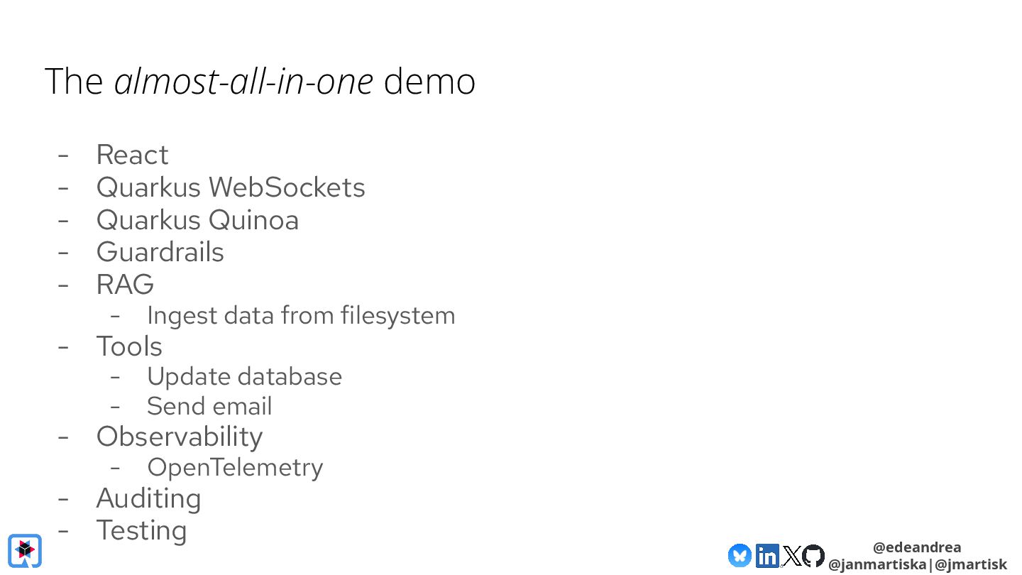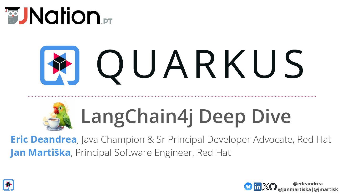 Then, we take a deeper dive into the Quarkus LangChain4j integration. We'll show how little code is needed when using Quarkus, how live reload makes experimenting with prompts a breeze and finally, we'll look at its native image generation capabilities, aiming to get your AI-powered app deployment-ready in no time.
