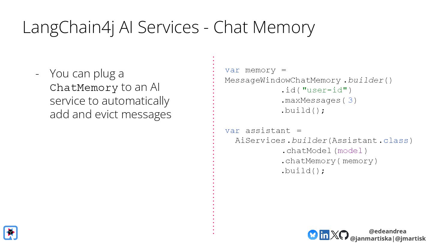 Join us for a guided tour through the possibilities of the LangChain4j framework! Chat with virtually any LLM provider (OpenAI, Gemini, HuggingFace, Azure, AWS, ...)? Generate AI images straight from your Java application with Dall-E and Gemini? Have LLMs return POJOs? Interact with local models on your machine? LangChain4j makes it a piece of cake! We will explain the fundamental building blocks of LLM-powered applications, show you how to chain them together into AI Services, and how to interact with your knowledge base using advanced RAG.