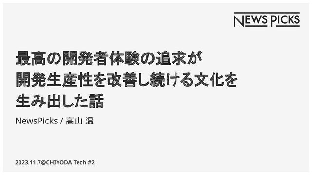 最高の開発者体験の追求が 開発生産性を改善し続ける文化を 生み出した話 2023.11.7@CHIYODA Tech #2 NewsPicks / 高山 温