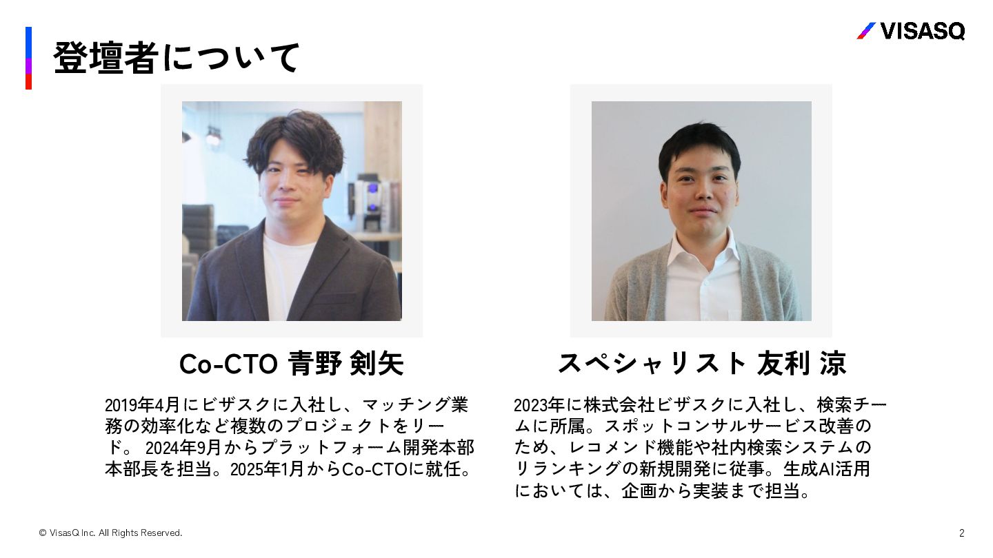 ド。 2024年9月からプラットフォーム開発本部 本部長を担当。2025年1月からCo-CTOに就任。 Co-CTO 青野 剣矢 スペシャリスト 友利 涼 2023年に株式会社ビザスクに入社し、検索チー ムに所属。スポットコンサルサービス改善の ため、レコメンド機能や社内検索システムの リランキングの新規開発に従事。生成AI活用 においては、企画から実装まで担当。