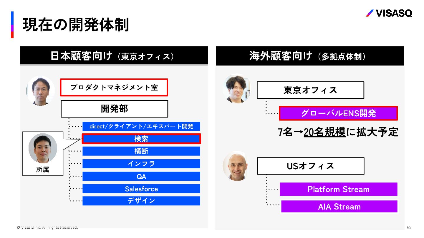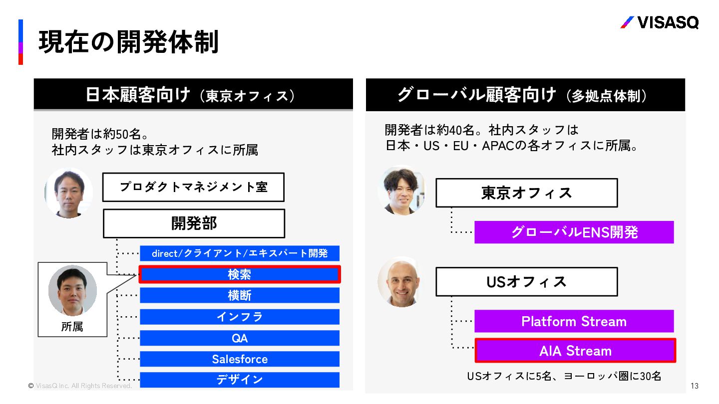 東京オフィス グローバルENS開発 USオフィス Platform Stream AIA Stream 開発部 direct/クライアント/エキスパート開発 検索 横断 インフラ QA Salesforce デザイン プロダクトマネジメント室 所属 7名→20名規模に拡大予定