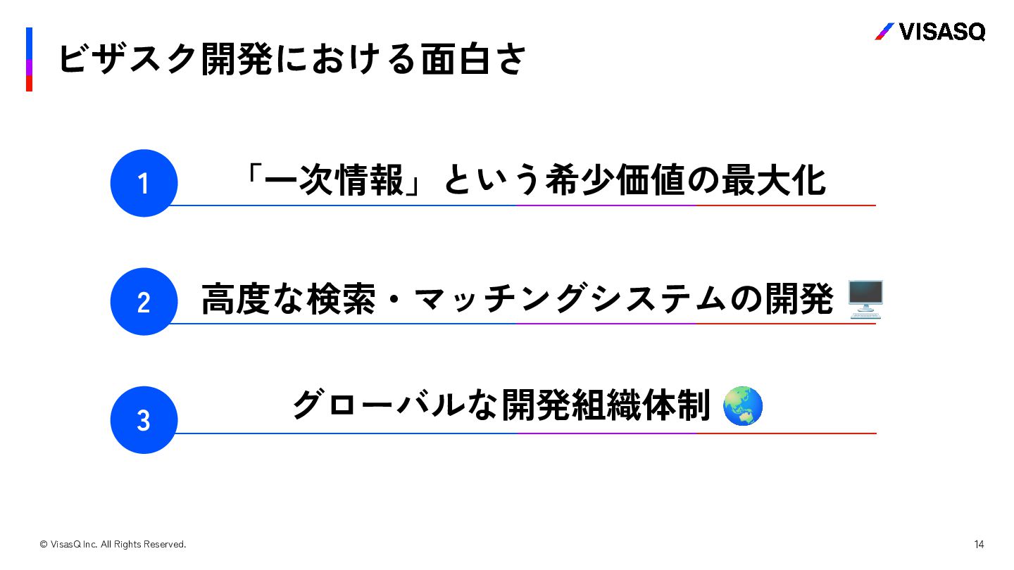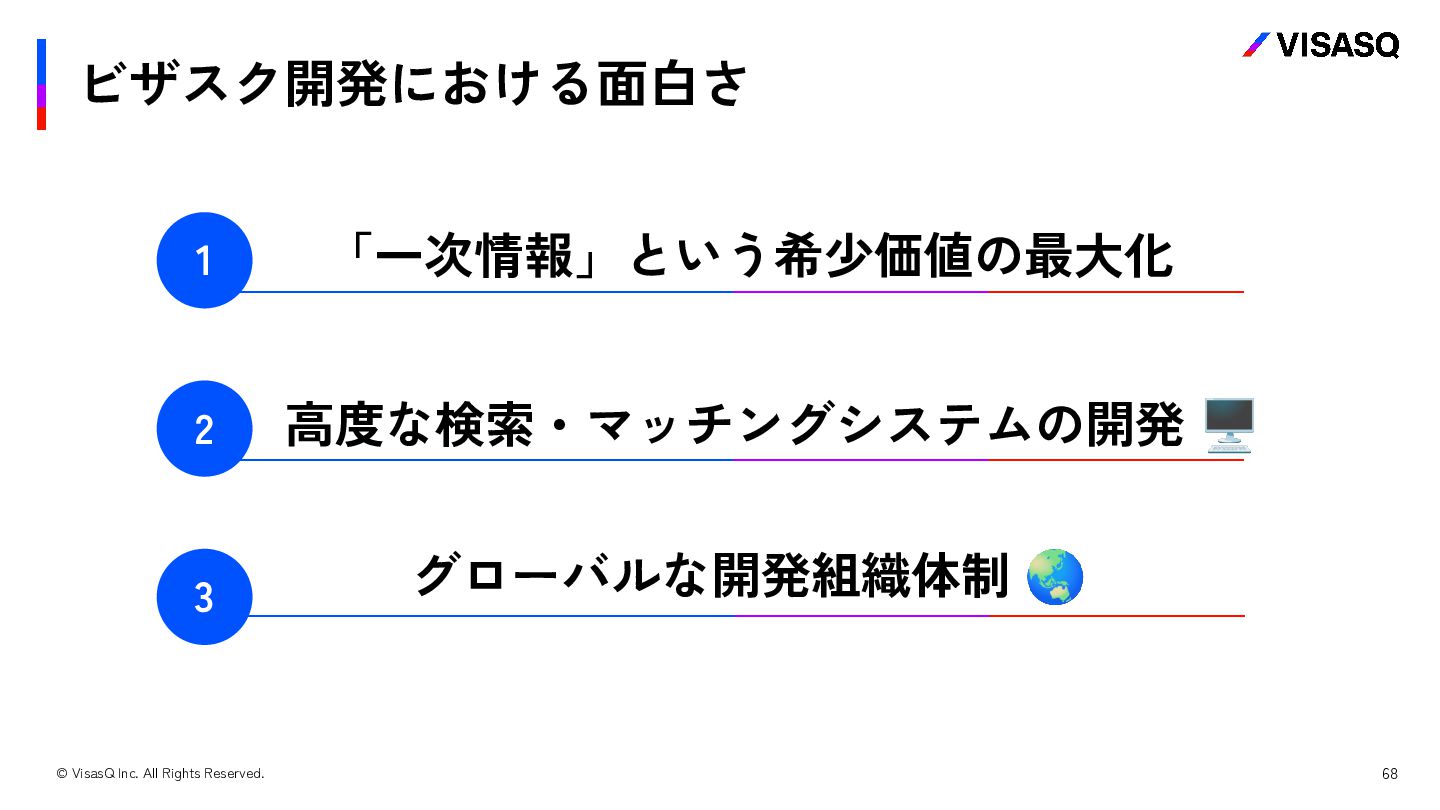 68 © VisasQ Inc. All Rights Reserved. ビザスク開発における面白さ 「一次情報」という希少価値の最大化 1