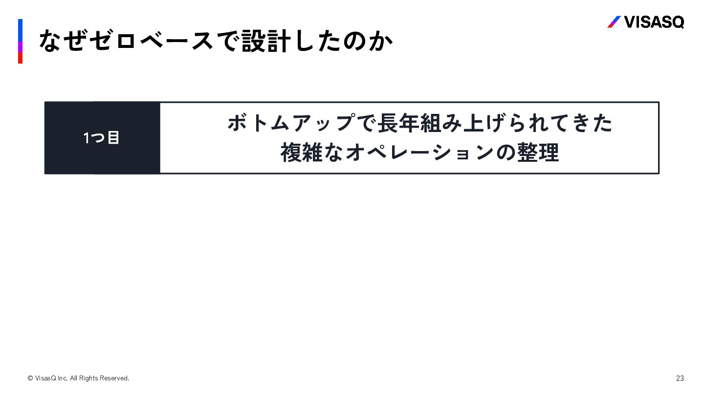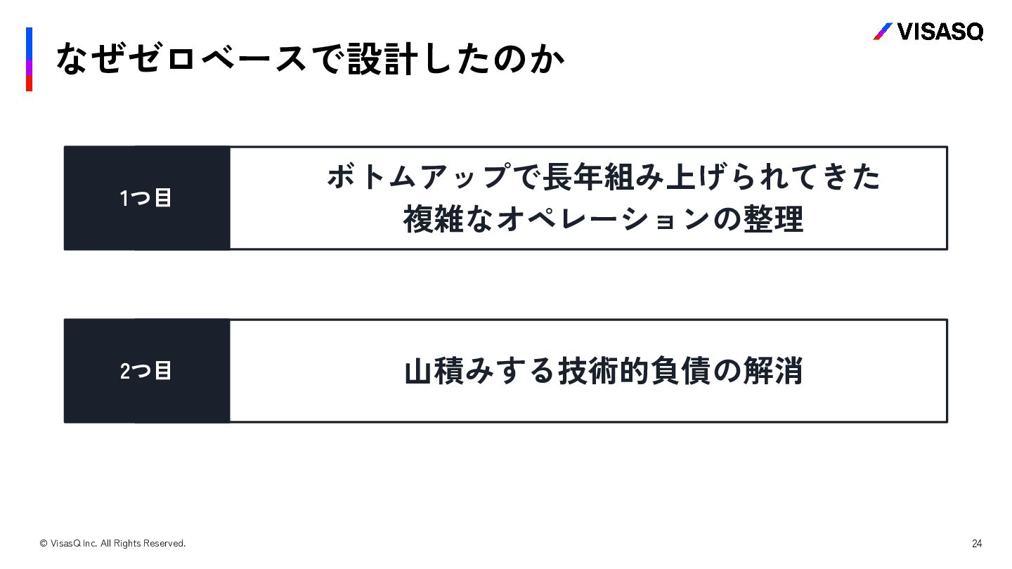 23 © VisasQ Inc. All Rights Reserved. なぜゼロベースで設計したのか ボトムアップで長年組み上げられてきた 複雑なオペレーションの整理