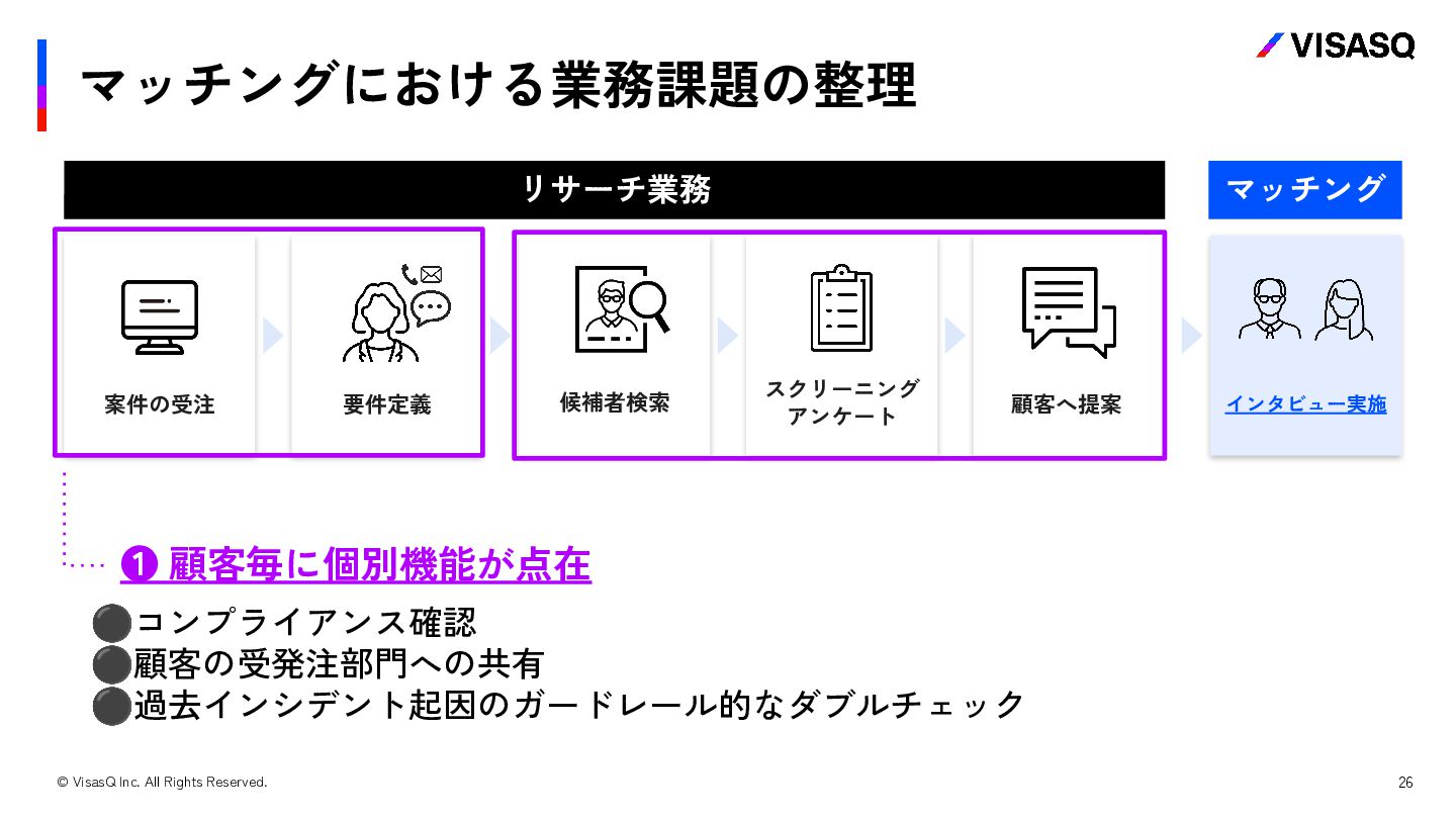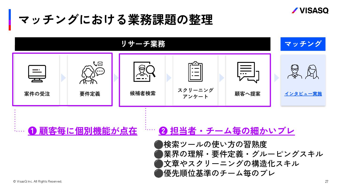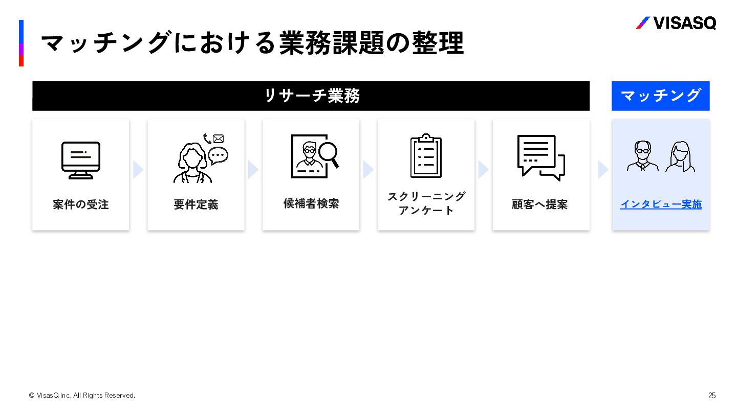 スクリーニング アンケート 顧客へ提案 インタビュー実施 リサーチ業務 マッチング マッチングにおける業務課題の整理