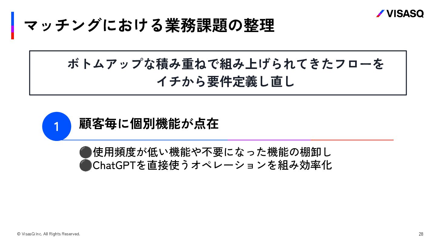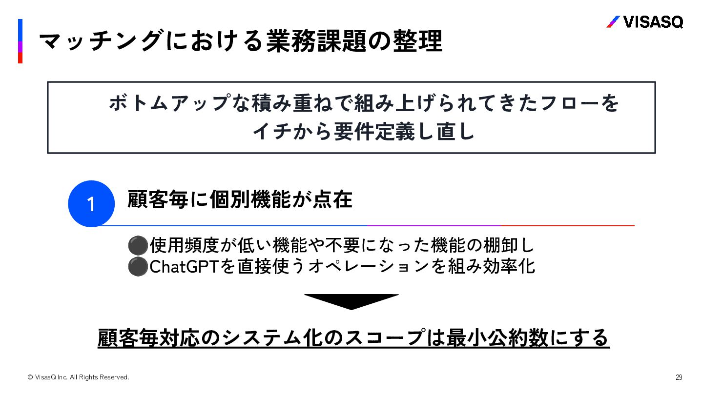 28 © VisasQ Inc. All Rights Reserved. マッチングにおける業務課題の整理 ボトムアップな積み重ねで組み上げられてきたフローを イチから要件定義し直し