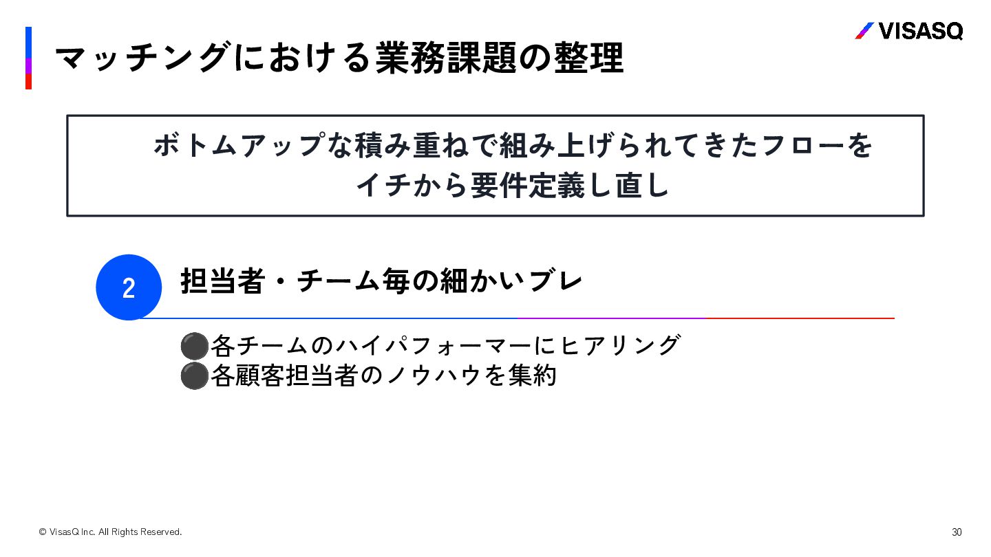 29 © VisasQ Inc. All Rights Reserved. マッチングにおける業務課題の整理 ボトムアップな積み重ねで組み上げられてきたフローを イチから要件定義し直し