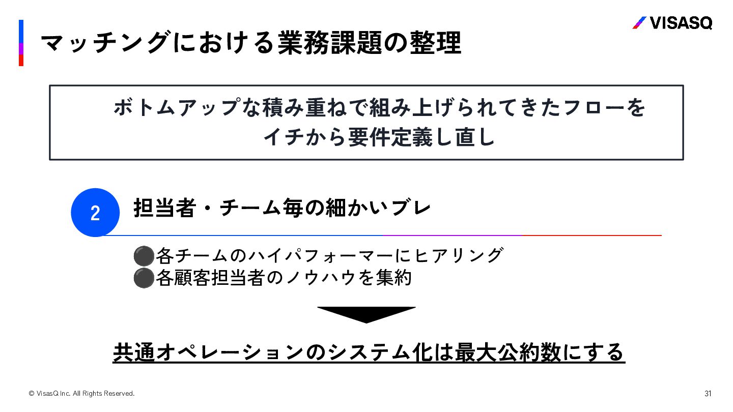 30 © VisasQ Inc. All Rights Reserved. マッチングにおける業務課題の整理 ボトムアップな積み重ねで組み上げられてきたフローを イチから要件定義し直し