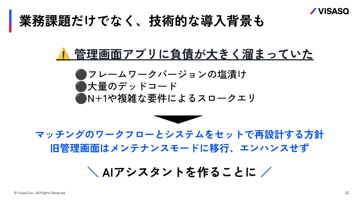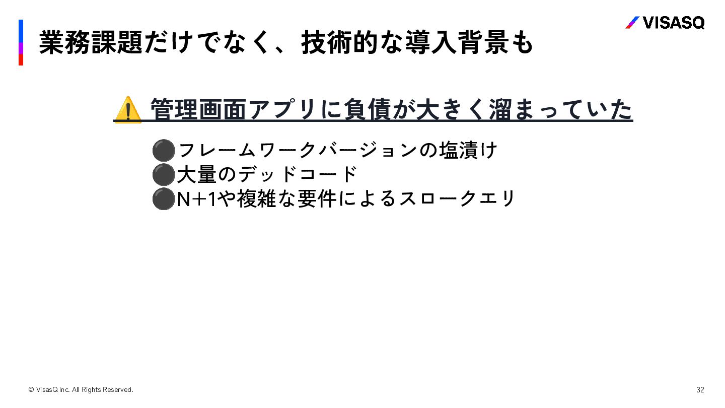 32 © VisasQ Inc. All Rights Reserved. 業務課題だけでなく、技術的な導入背景も ⚠ 管理画面アプリに負債が大きく溜まっていた
