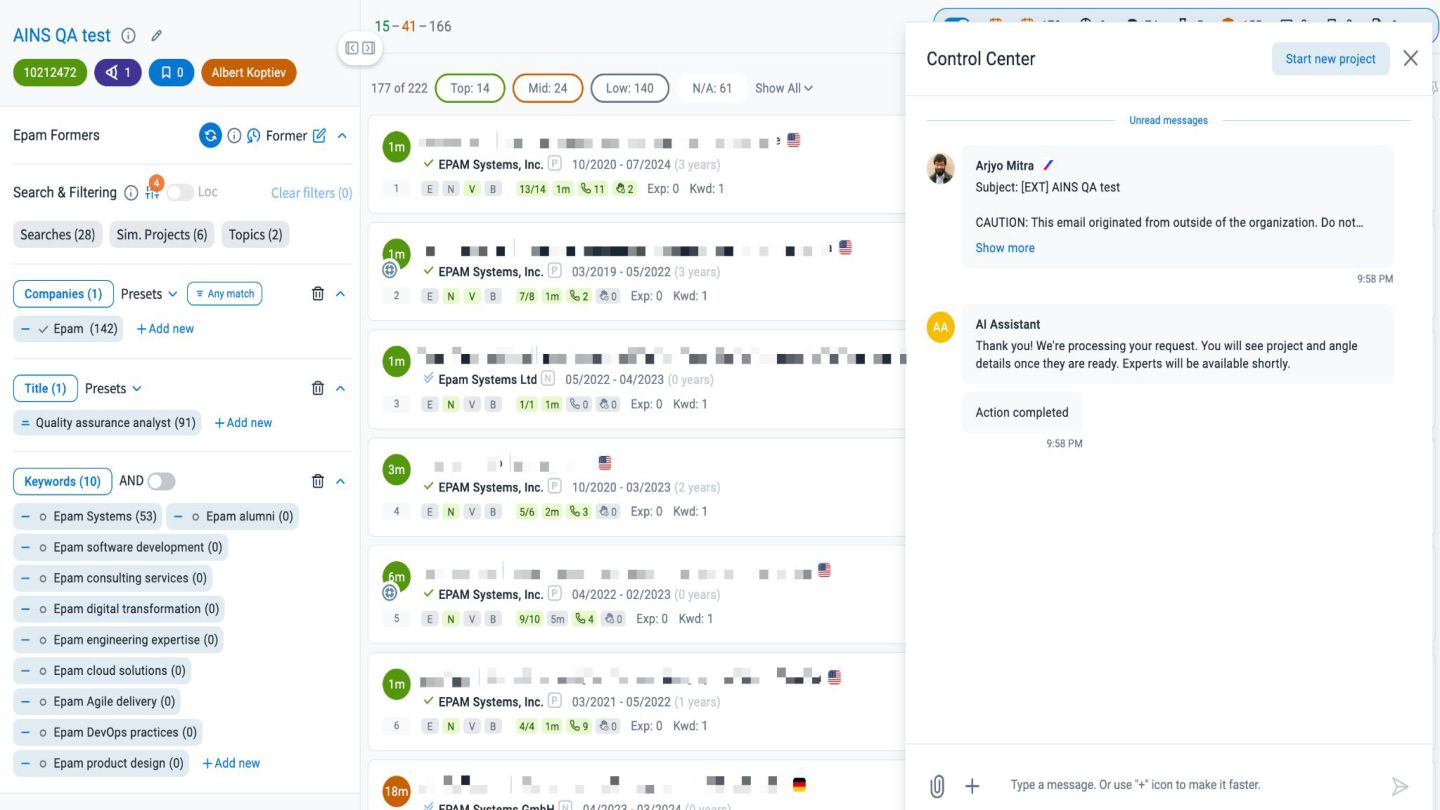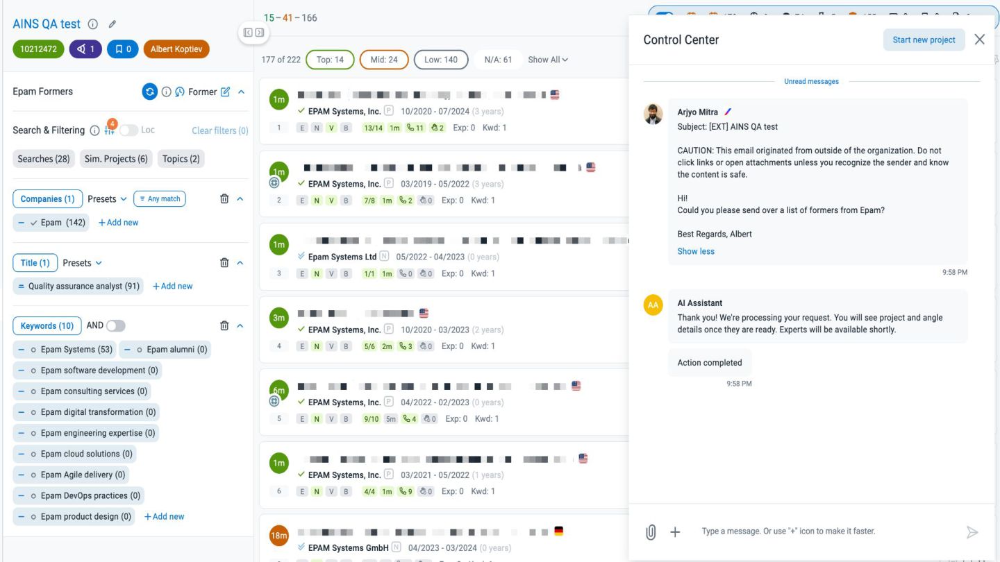 候補者検索 スクリーニング アンケート 顧客へ提案 インタビュー実施 リサーチ業務 マッチング Angle Generator / Enricher ⚫メールの依頼文書に基づき案件データを作成 ⚫ルールベースとプロンプトエンジニアリングの組み合わせ ⚫複数の想定候補者がある場合のカテゴライズ ⚫依頼内容から想定する候補者のペルソナ生成