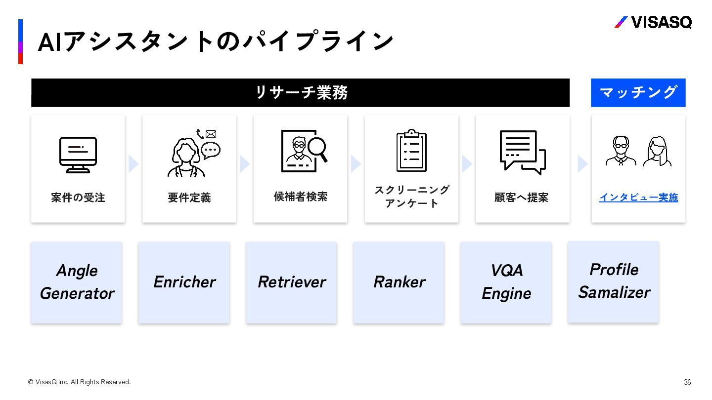 候補者検索 スクリーニング アンケート 顧客へ提案 インタビュー実施 リサーチ業務 マッチング Enricher Retriever Ranker VQA Engine Angle Generator Profile Samalizer