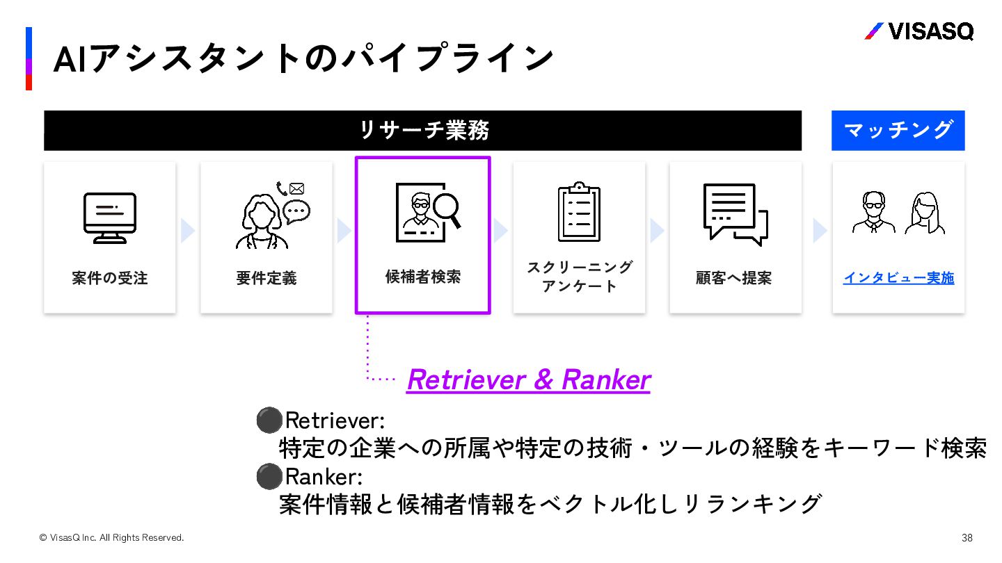 候補者検索 スクリーニング アンケート 顧客へ提案 インタビュー実施 リサーチ業務 マッチング Retriever & Ranker ⚫Retriever: 特定の企業への所属や特定の技術・ツールの経験をキーワード検索 ⚫Ranker: 案件情報と候補者情報をベクトル化しリランキング