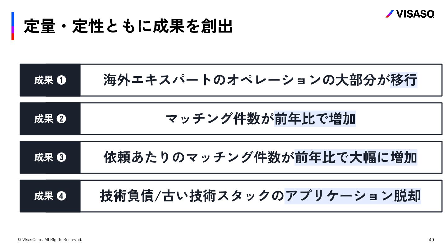 40 © VisasQ Inc. All Rights Reserved. 定量・定性ともに成果を創出 海外エキスパートのオペレーションの大部分が移行 成果