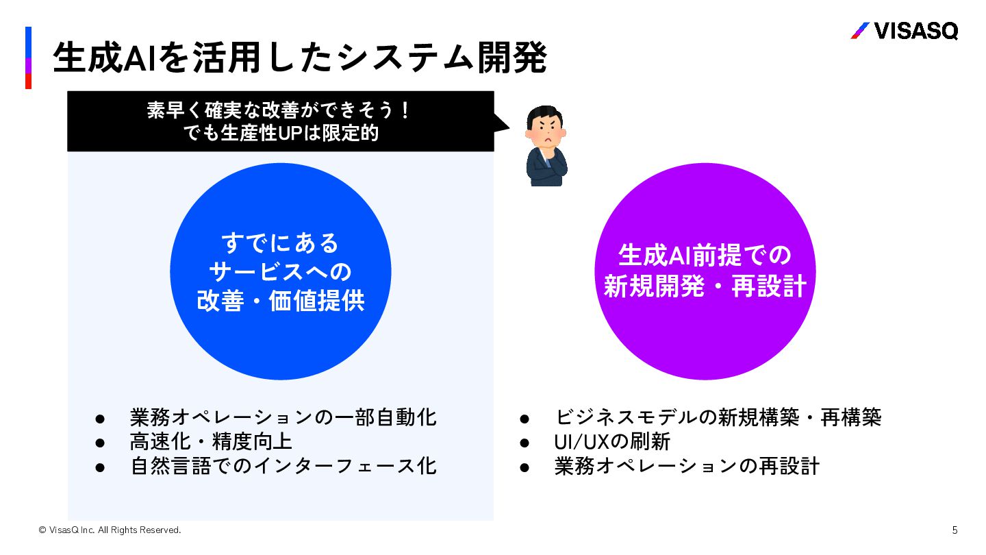 4 © VisasQ Inc. All Rights Reserved. 生成AIを活用したシステム開発 すでにある サービスへの