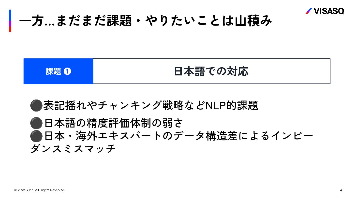 ❶ ⚫表記揺れやチャンキング戦略などNLP的課題 ⚫日本語の精度評価体制の弱さ ⚫日本・海外エキスパートのデータ構造差によるインピー ダンスミスマッチ