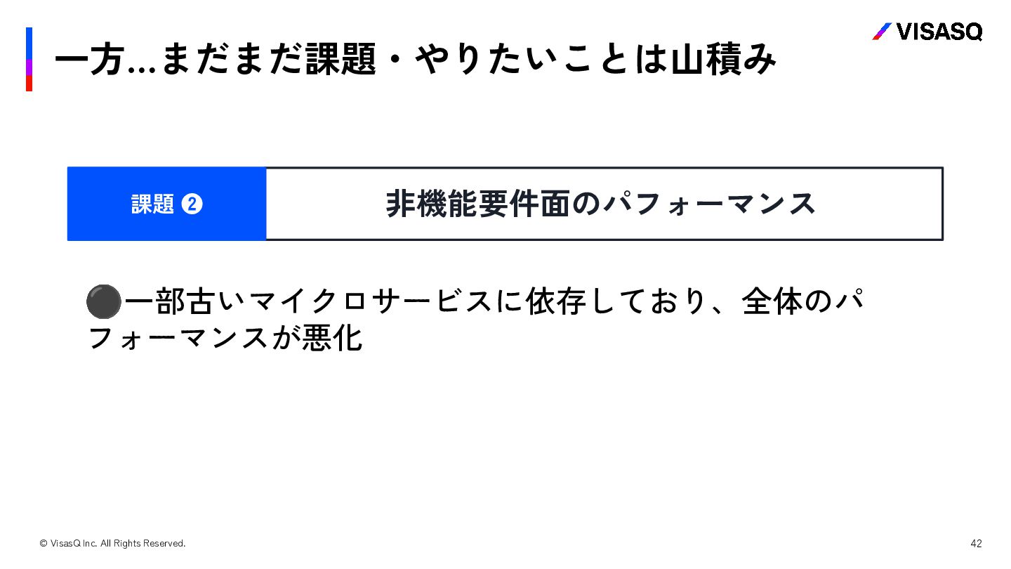 42 © VisasQ Inc. All Rights Reserved. 一方…まだまだ課題・やりたいことは山積み 非機能要件面のパフォーマンス 課題